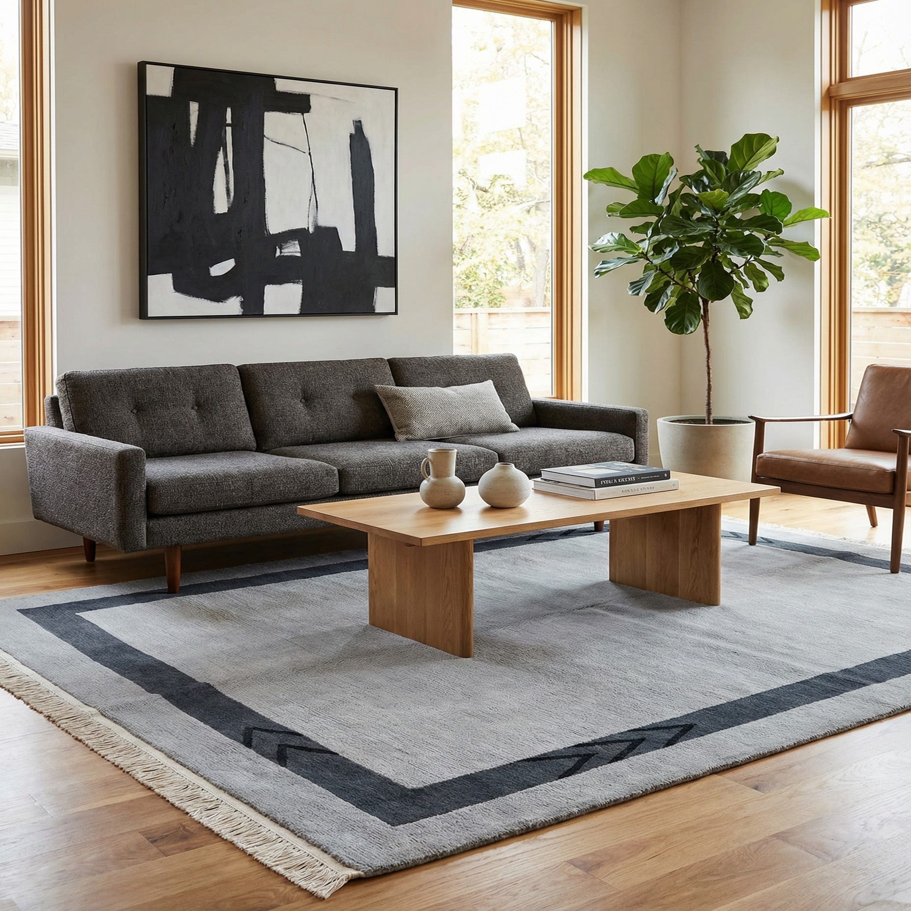 A 5x8 rectangular gray wool rug with a dark gray modern abstract border pattern and fringe.