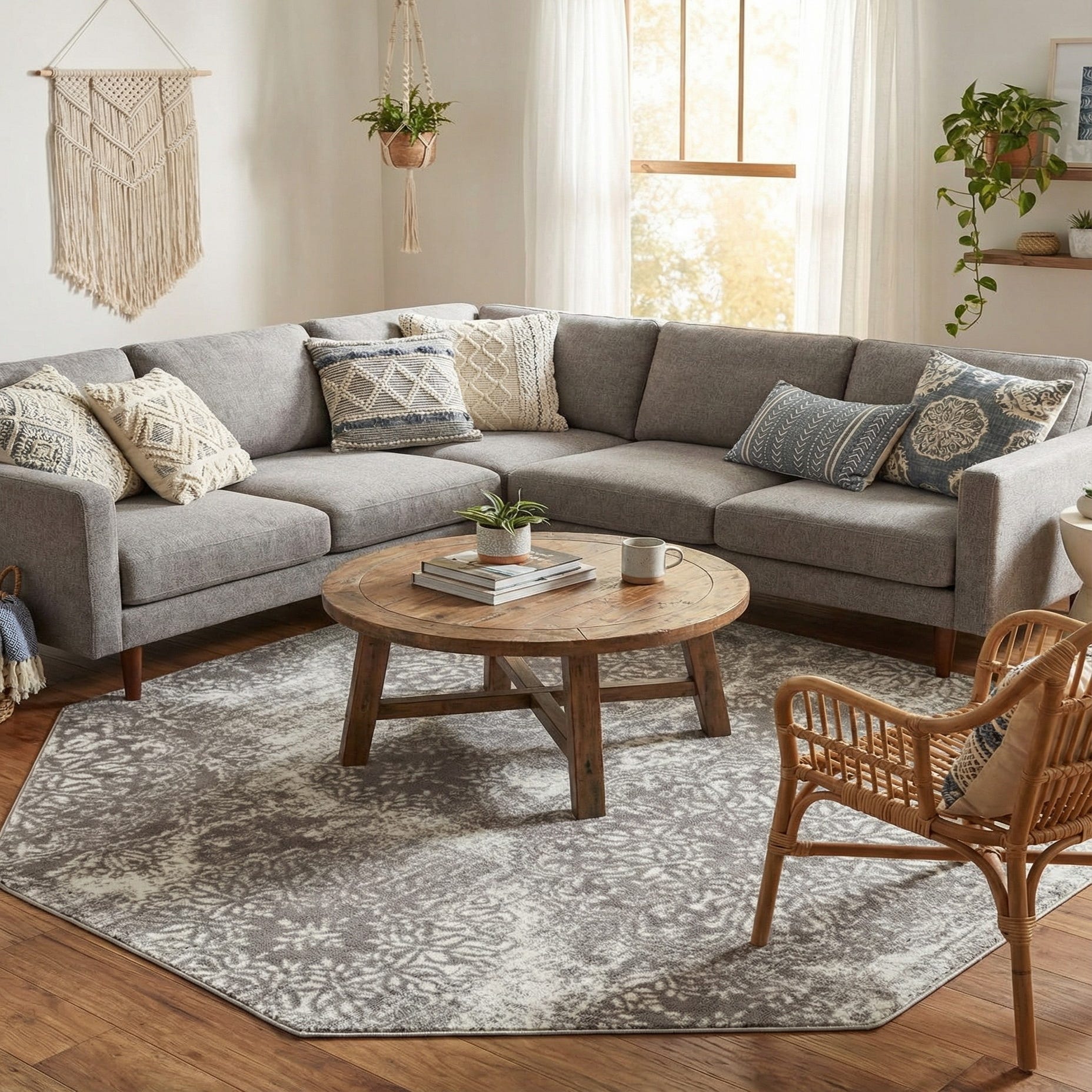 The octagonal shape and subtle colors make this piece ideal for an entry hall, a small dining nook with a pedestal table, or layered beneath a seating vignette to add visual interest without overwhelming the room. Pair it with light wood furniture and linen upholstery for a relaxed Scandinavian feel, or combine it with mixed metals and glass accents in a contemporary transitional setting. Its neutral tones coordinate easily with ivory, taupe, and soft blues to anchor calm, understated interiors.