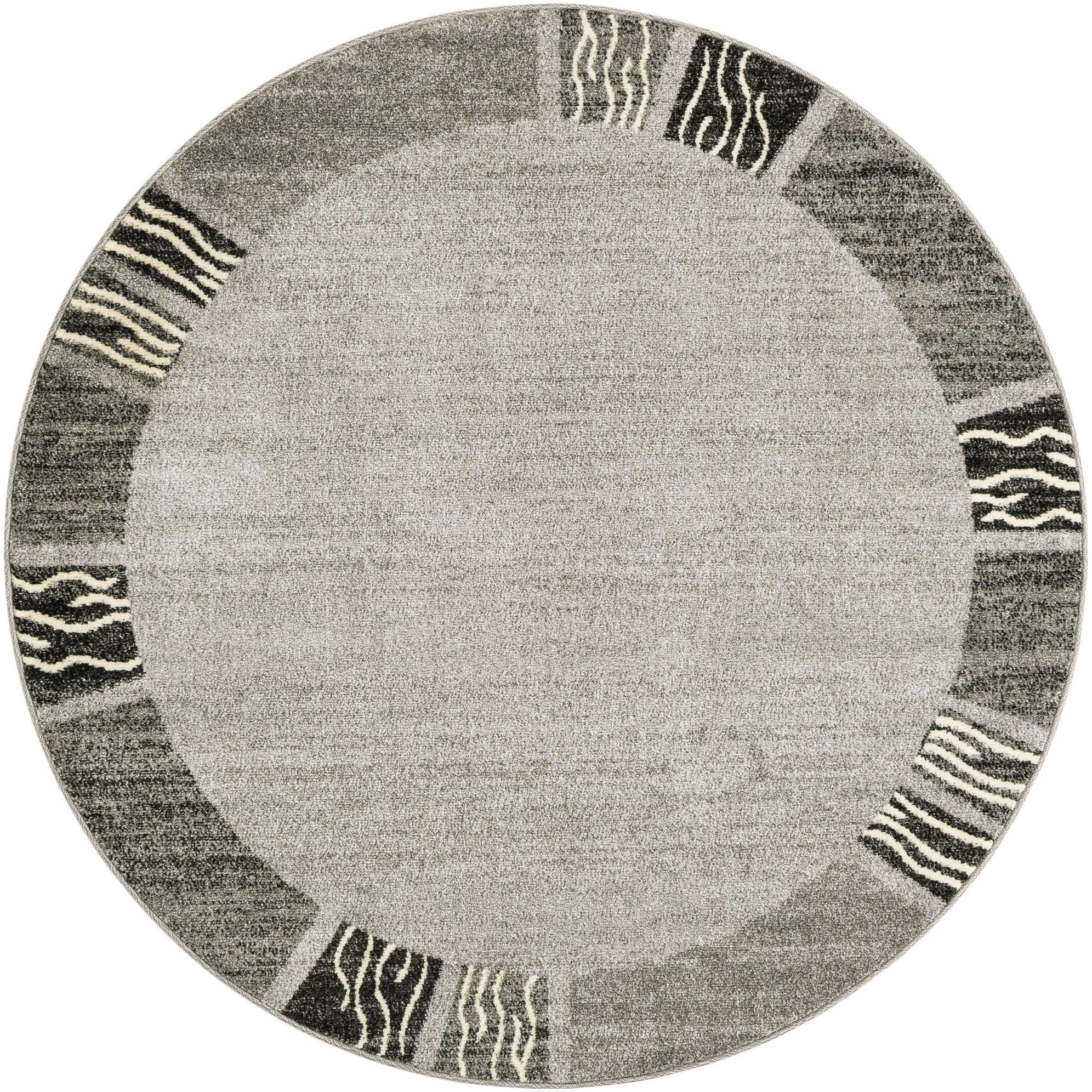 A 6' 0 x 6' 0 round gray area rug with a medium pile, featuring a contemporary border with abstract black and white wavy patterns.
