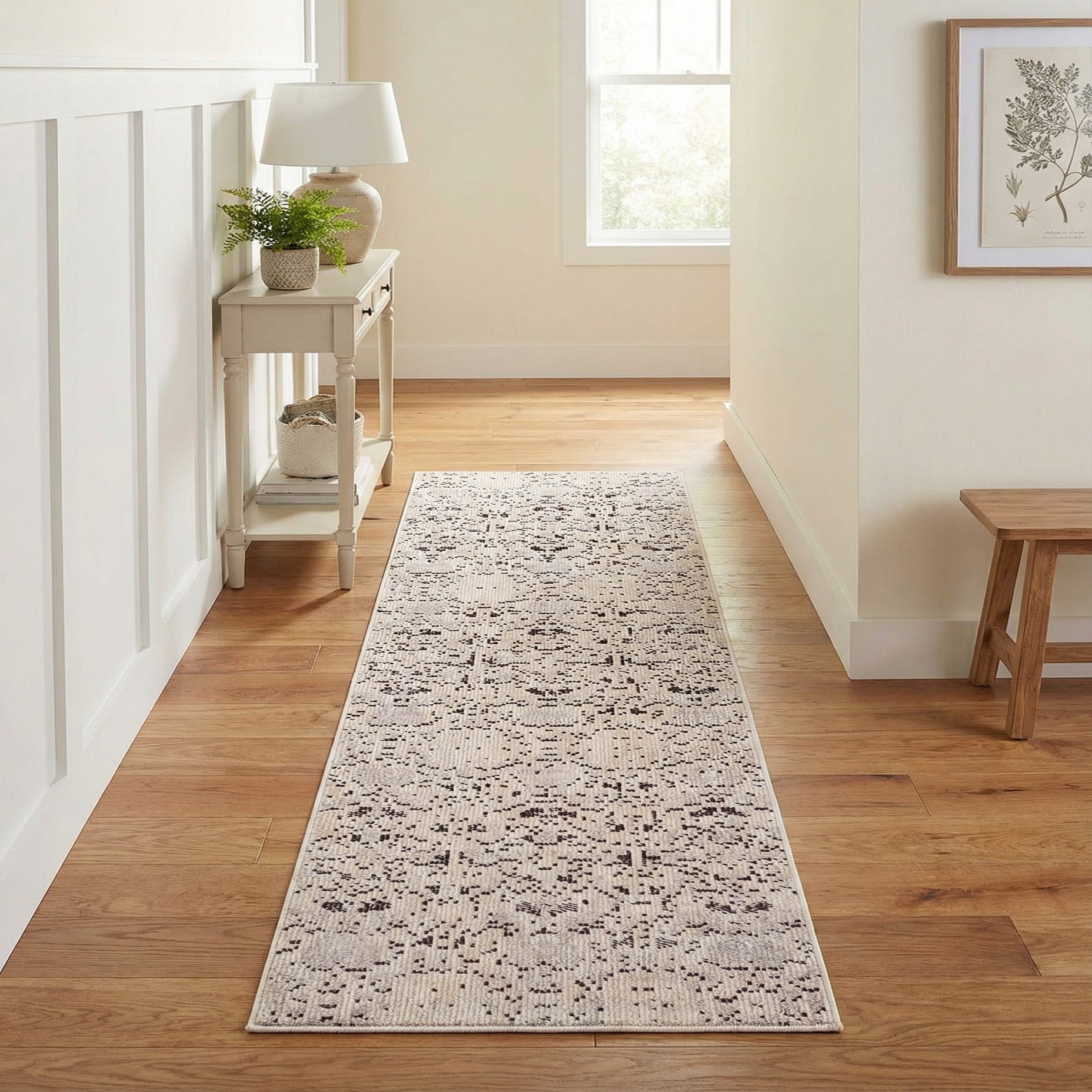 Machine made from 100% polypropylene, this runner pairs easily with transitional and modern farmhouse interiors and works well when layered into neutral, Scandinavian, or minimalist schemes. Use it along a hallway or entry to anchor circulation, place it beside a bed to soften morning steps, or lay it in a narrow kitchen or galley to introduce quiet pattern without overwhelming the space. The restrained palette and worn character make it an adaptable choice for rooms that need warmth and texture while maintaining a clean, contemporary look.