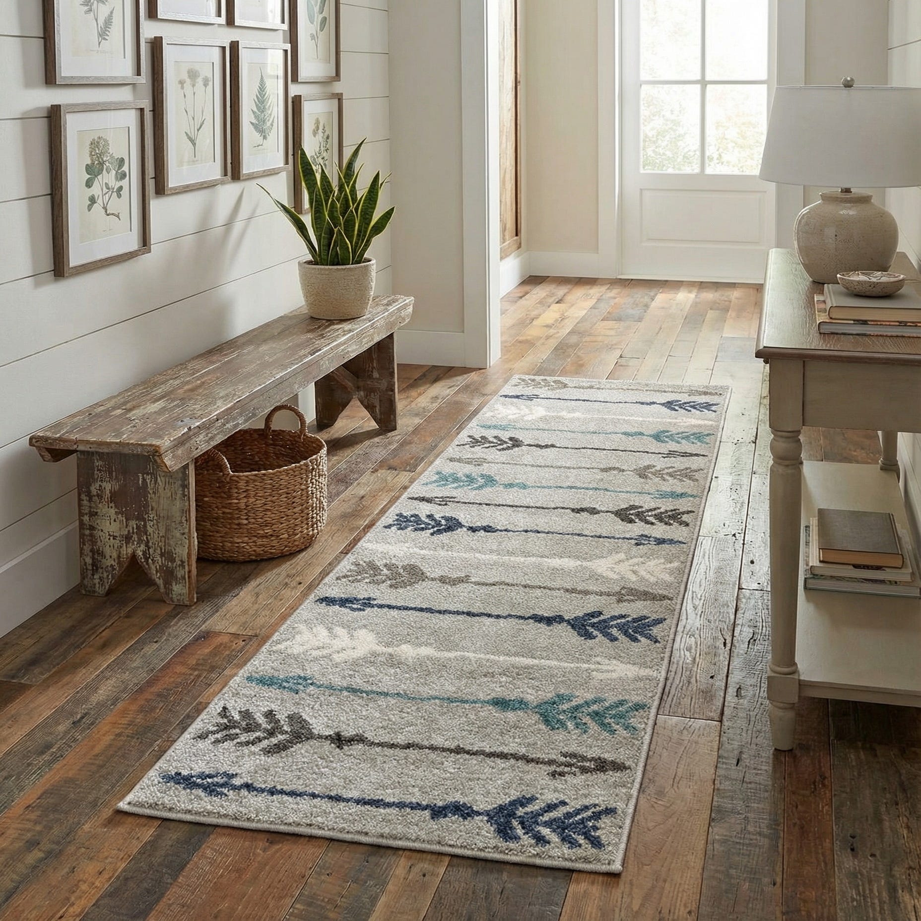 This runner suits hallways, entryways, or layered in narrow transitional spaces where a touch of pattern keeps the room from feeling flat. Pair it with warm wood floors and ivory or navy upholstery for a coordinated palette, add teal or light-blue accents for a fresh, coastal touch, or use it in a child's room to bring playful linear movement without overwhelming the space.