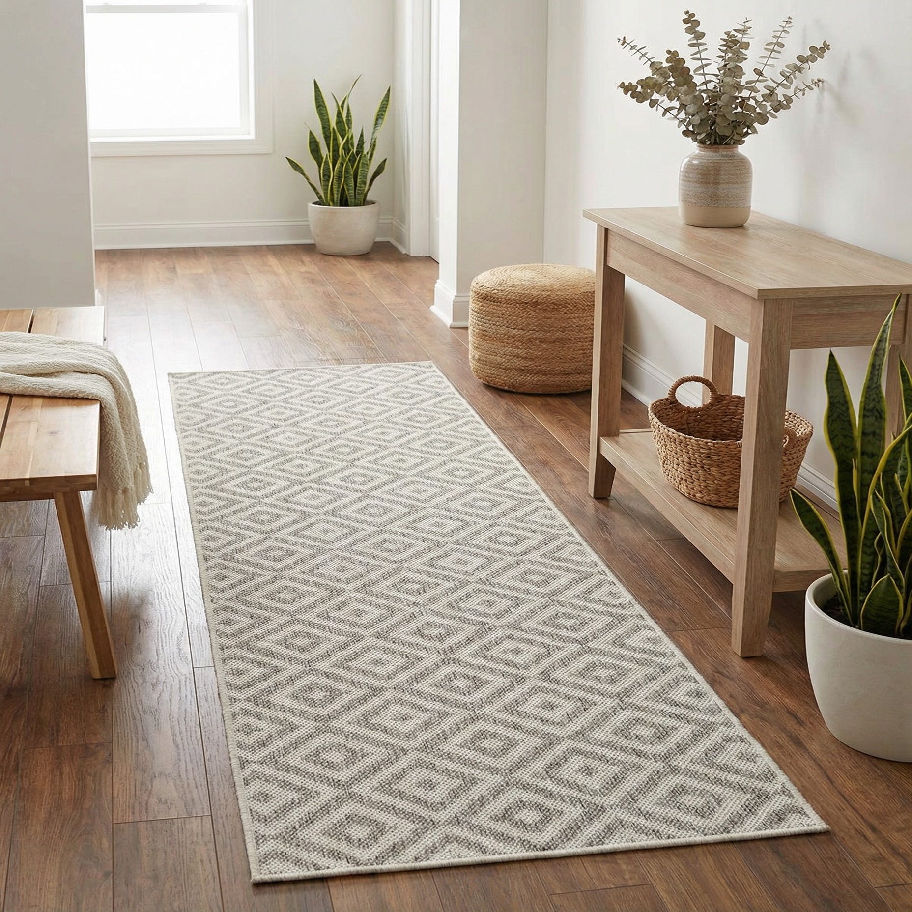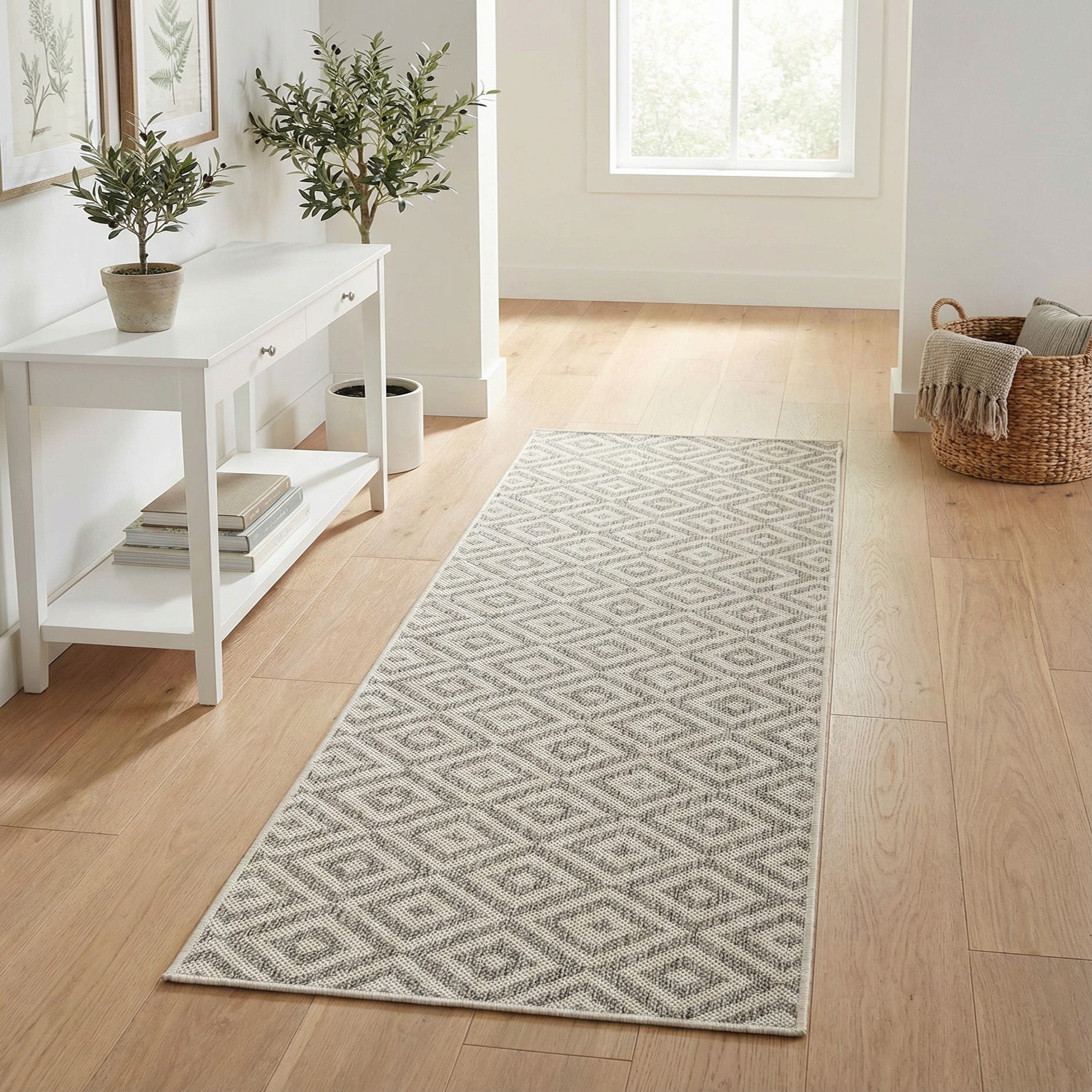 This runner works well in hallways and entryways, along kitchen aisles, or on covered porches where a narrow, durable accent is needed. Its neutral tones and geometric pattern suit contemporary, coastal, or transitional interiors and pair nicely with weathered woods, metal accents, and light upholstery. Use it to anchor a slim console or to guide traffic through a long corridor for consistent style and understated structure.