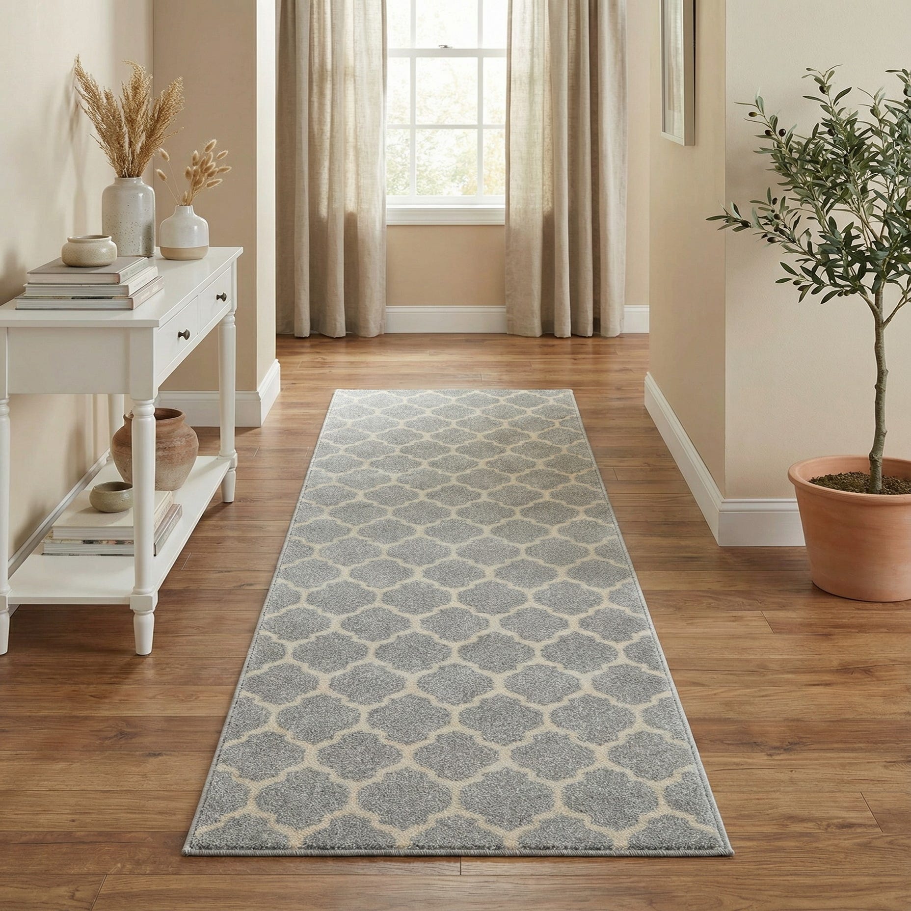 A softly patterned runner with a repeating Moroccan-inspired lattice in warm beige set against a light gray field. The geometric motif creates a steady, balanced rhythm that reads modern yet familiar, while the beige outlines add a touch of contrast without overwhelming the neutral ground. Machine-made from 100% polypropylene, the pile has a low-to-medium height that feels dense and slightly springy underfoot, offering a smooth, even surface with a subtle, soft texture.