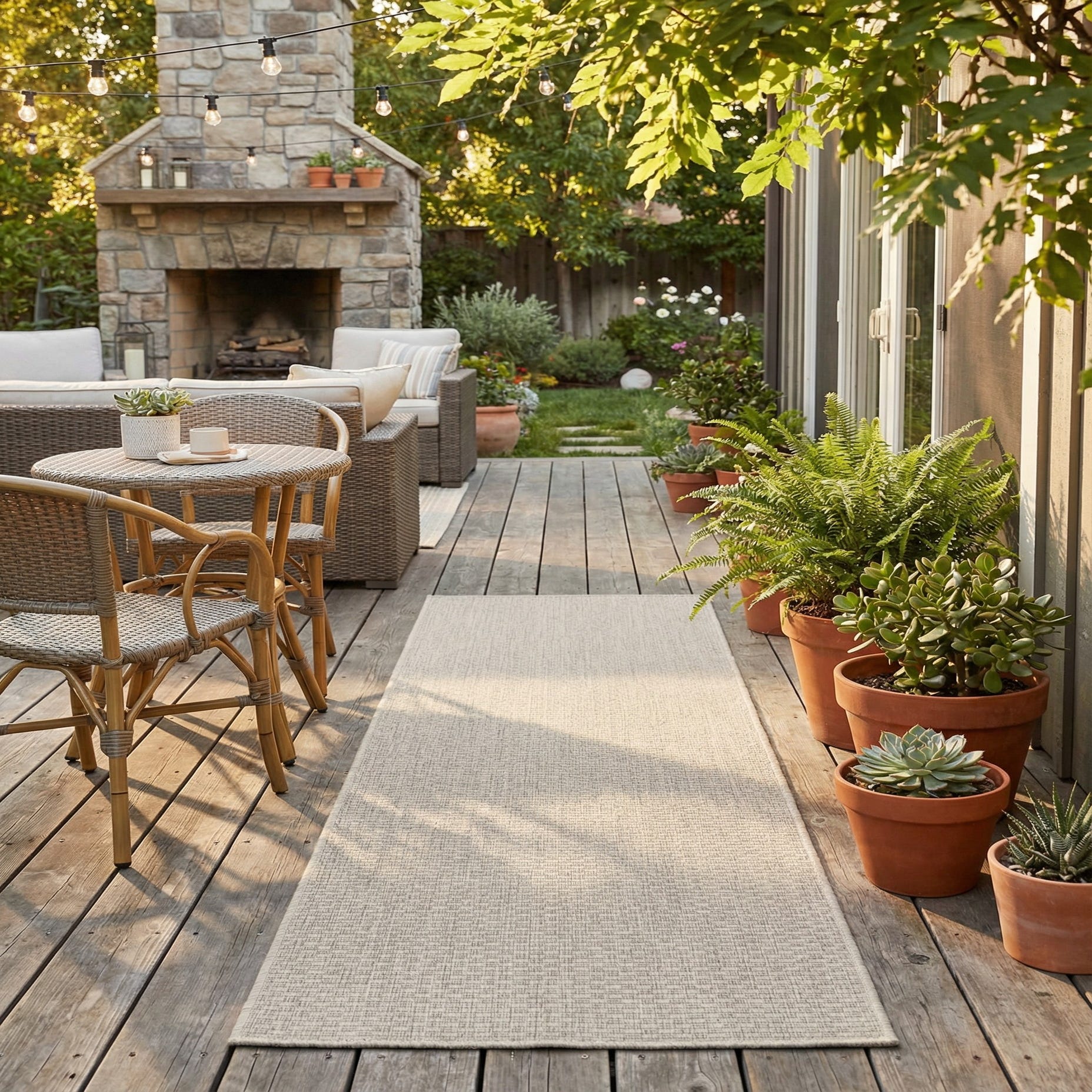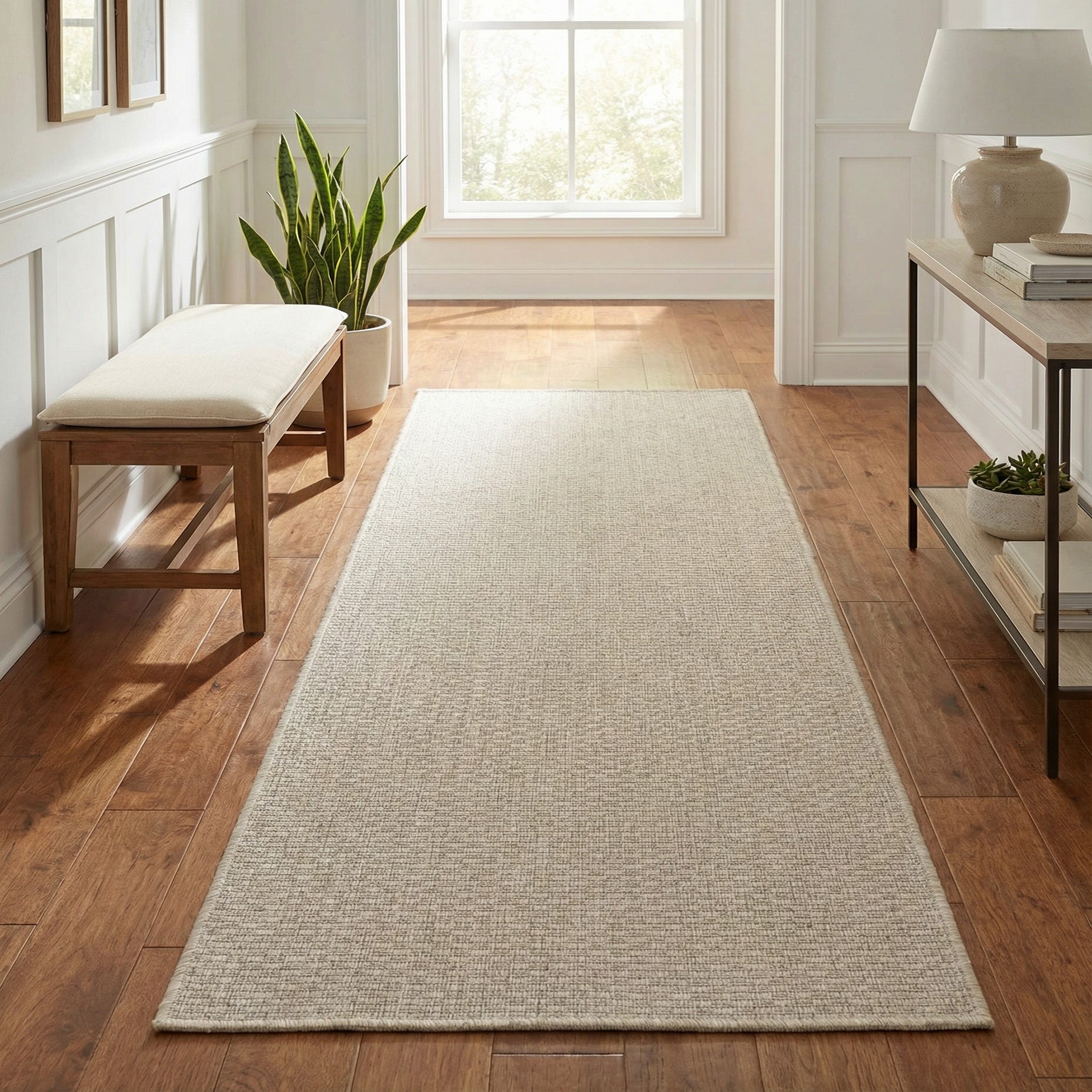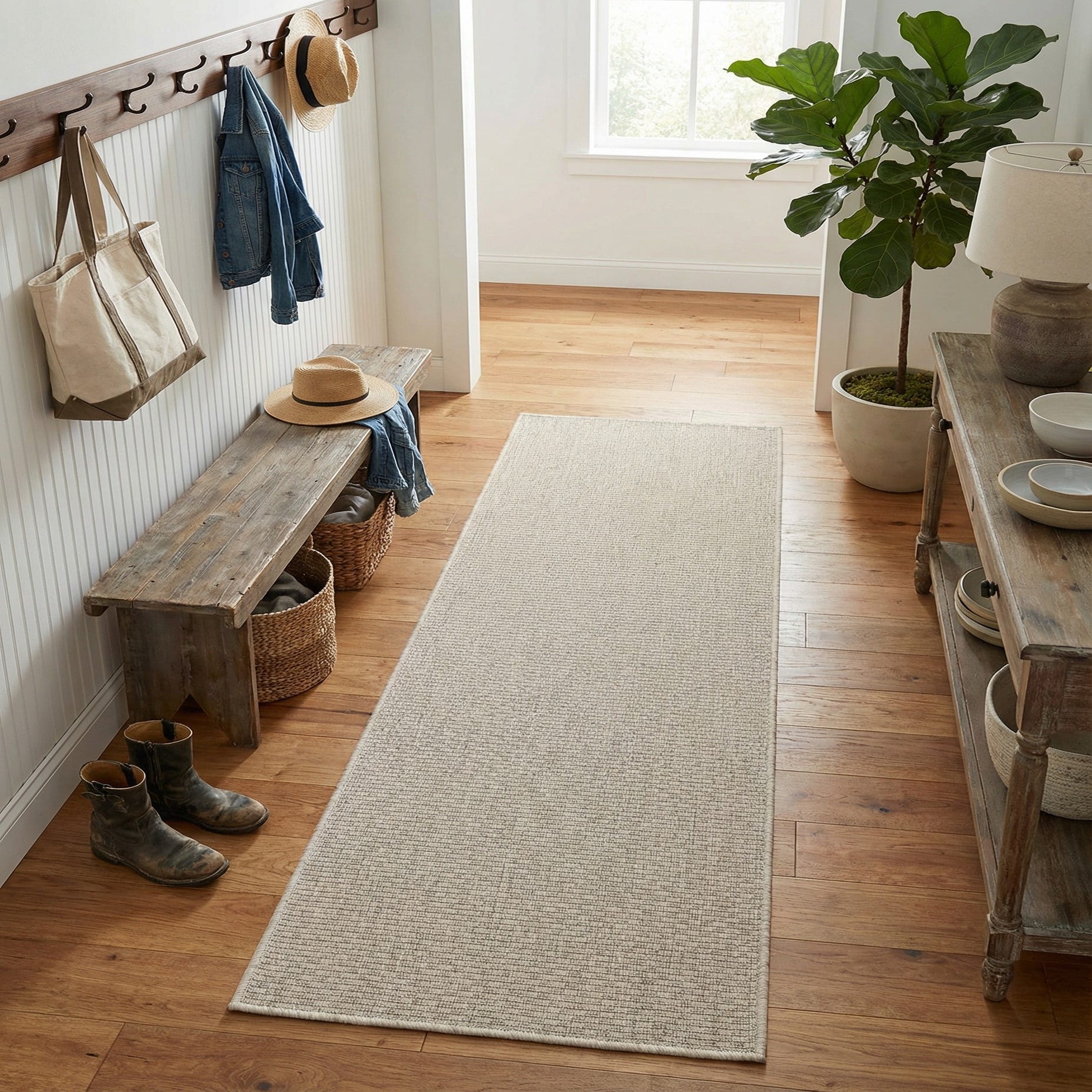 This runner is well suited for entryways, hallways, kitchens, or a covered patio where a durable, low-maintenance floor layer is needed. It pairs naturally with coastal, Scandinavian, modern farmhouse, or minimalist interiors and complements light wood tones, white or soft gray walls, and mixed-material furnishings like rattan chairs or matte black metal accents.