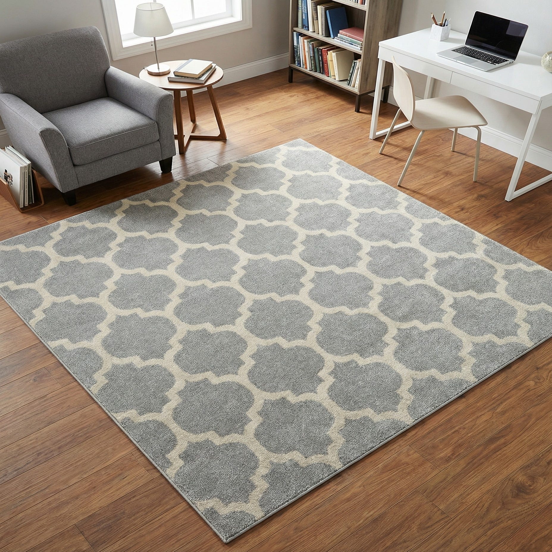 A soft, low-pile rug with a classic Moroccan trellis pattern in warm beige set against a light gray background. The repeating arabesque motifs create a balanced, symmetrical layout that reads clean and approachable. The polypropylene construction produces a smooth, slightly springy hand underfoot with a subtle, low-sheen finish that keeps the look refined without drawing too much attention.