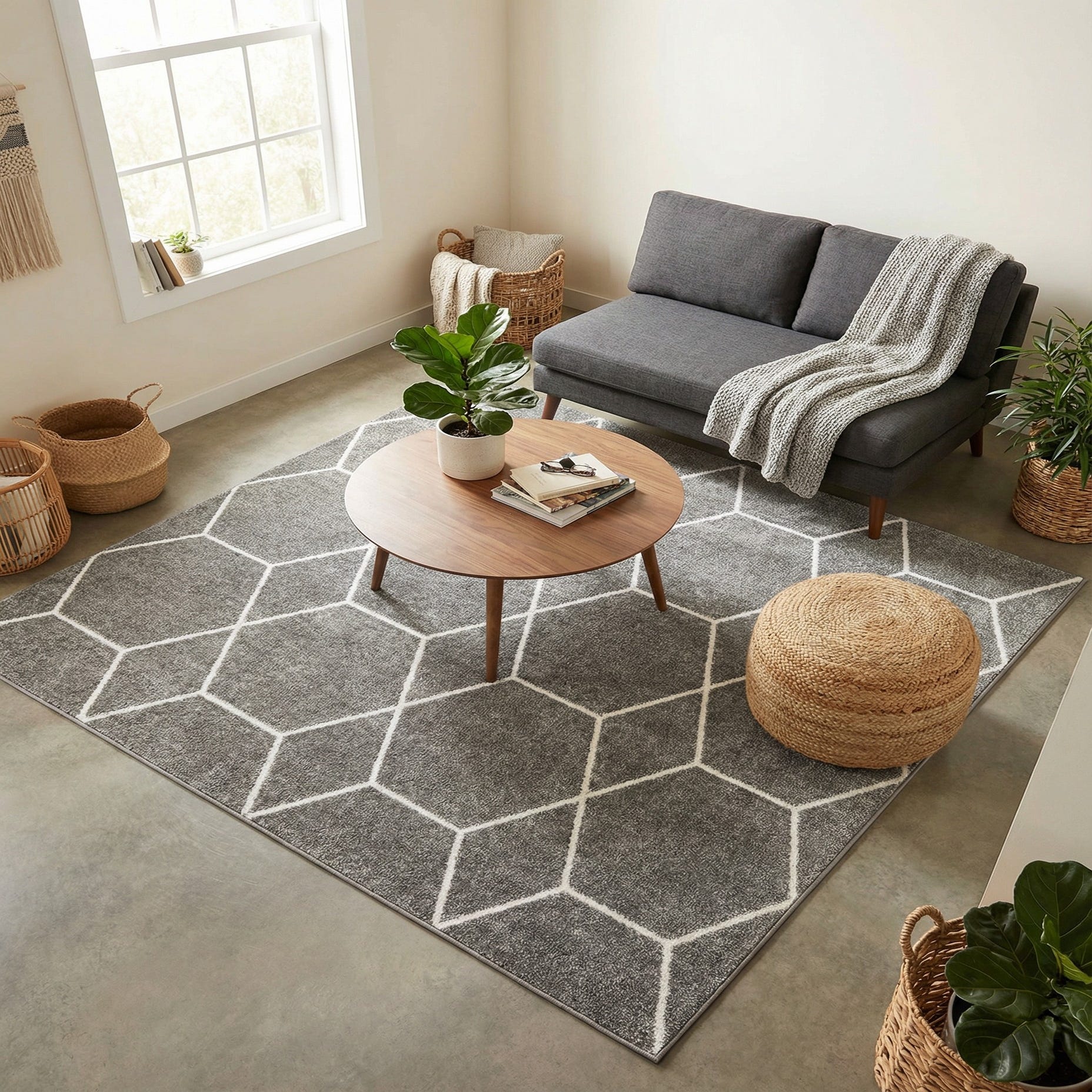 This neutral palette and structured pattern work well in contemporary and transitional settings — place it under a low-profile sofa and coffee table to anchor a living area, layer it beneath a bed to add quiet pattern to a bedroom, or use it to define a home office or dining nook. The light gray and ivory pair nicely with warm wood tones, matte black or brass accents, and breathable linens, making it easy to integrate into minimalist, Scandinavian, or softly layered interiors.