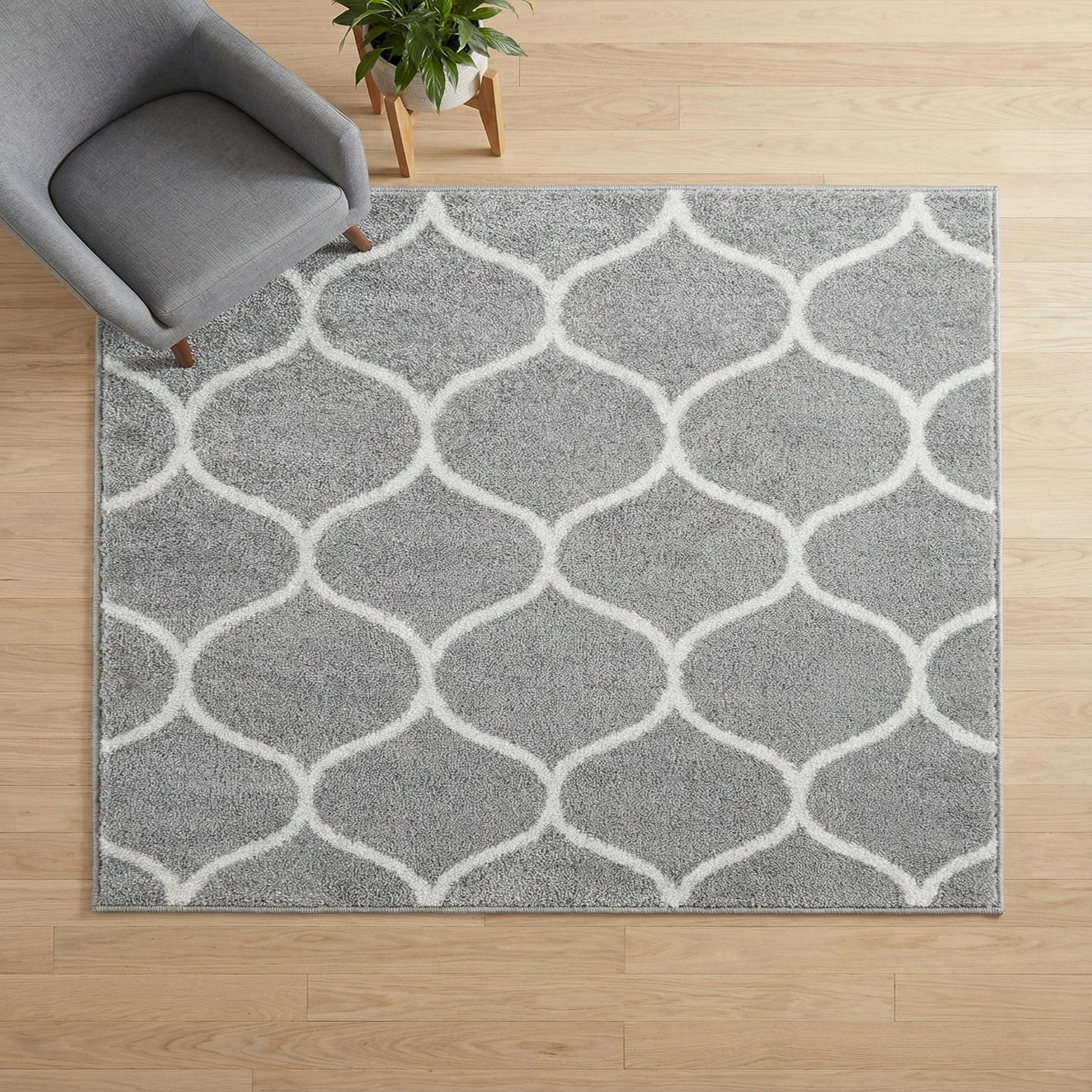 A soft, geometric trellis pattern in ivory traces gentle curves across a light gray field, creating a calm, modern look that balances pattern with neutral color. The machine-made construction in 100% polypropylene produces a dense, cut pile that feels plush underfoot while the slightly raised ivory lines add low-relief texture and subtle shadowing. The result is a tactile surface with a comfortable, cushioned feel and a refined but approachable appearance.