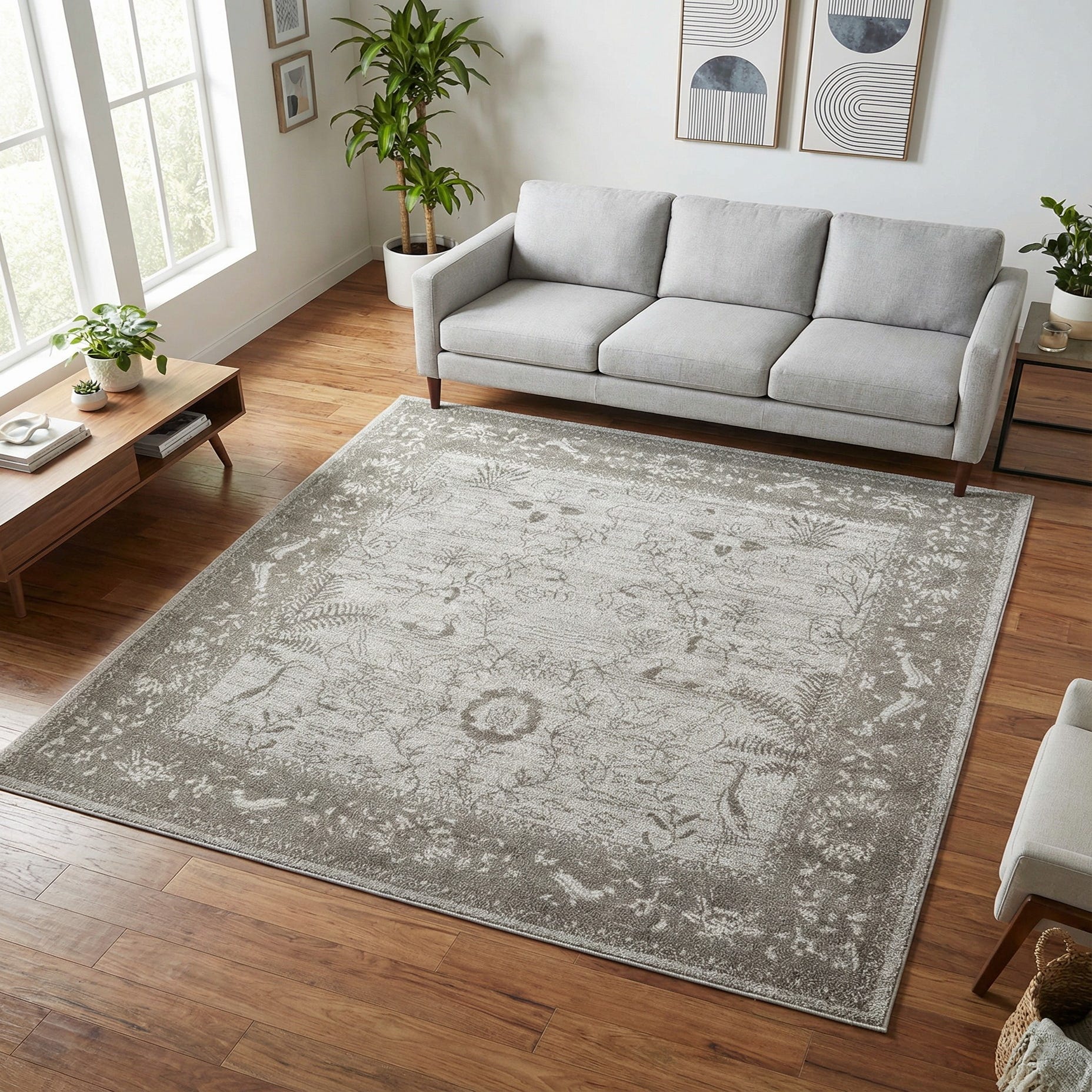 The Miranda Collection offers a refined touch to any room with its sophisticated pattern and soft color palette. This 6 Ft Square rug boasts a delicate blending of light gray and gray tones, set against a light gray background that encapsulates contemporary elegance. Machine-woven of 100% polypropylene, this durable piece is designed to withstand the demands of daily life while retaining its visual appeal.