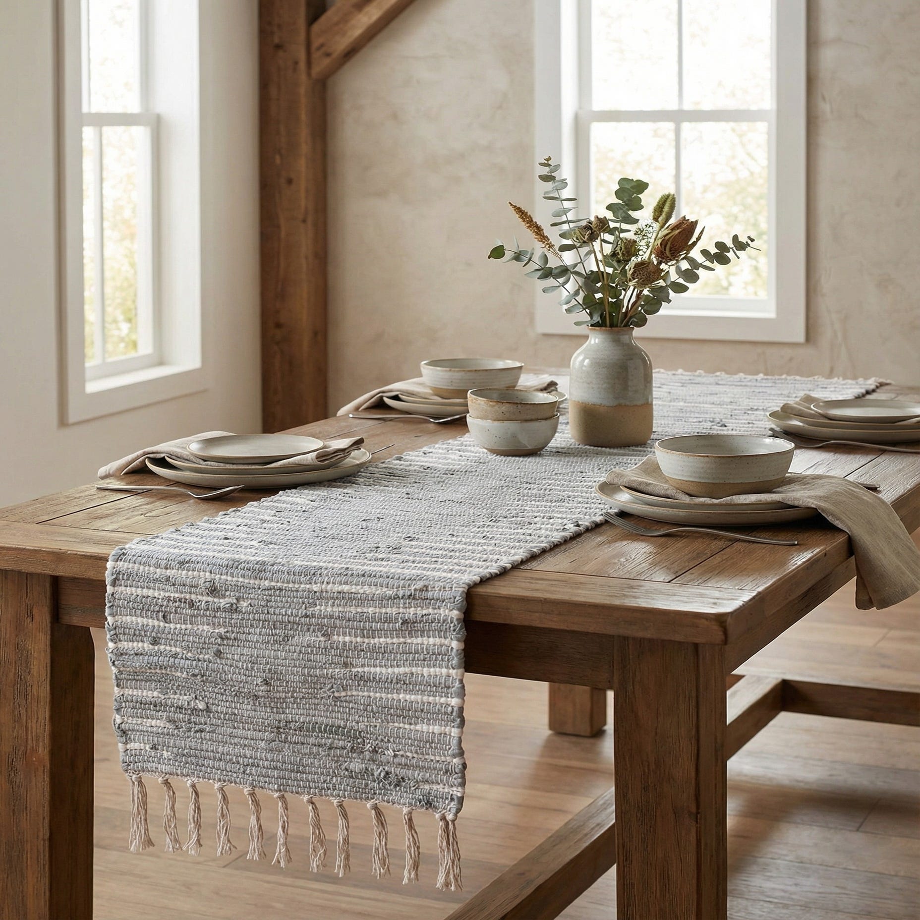 Hand-woven of 100% cotton, this table runner has a flatweave construction with a light gray background threaded with irregular ivory bands that form a relaxed horizontal stripe pattern. The surface is tactile — you can feel the subtle slub texture where the ivory ribbons weave through the gray ground, and the open fringe on each end adds a casual finish. Its low-profile weave lies flat on tabletops while adding visible texture and gentle contrast.