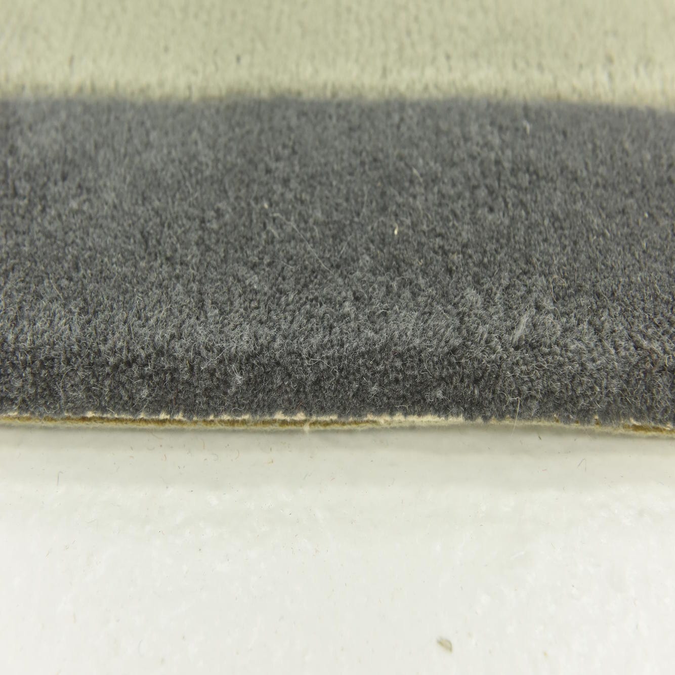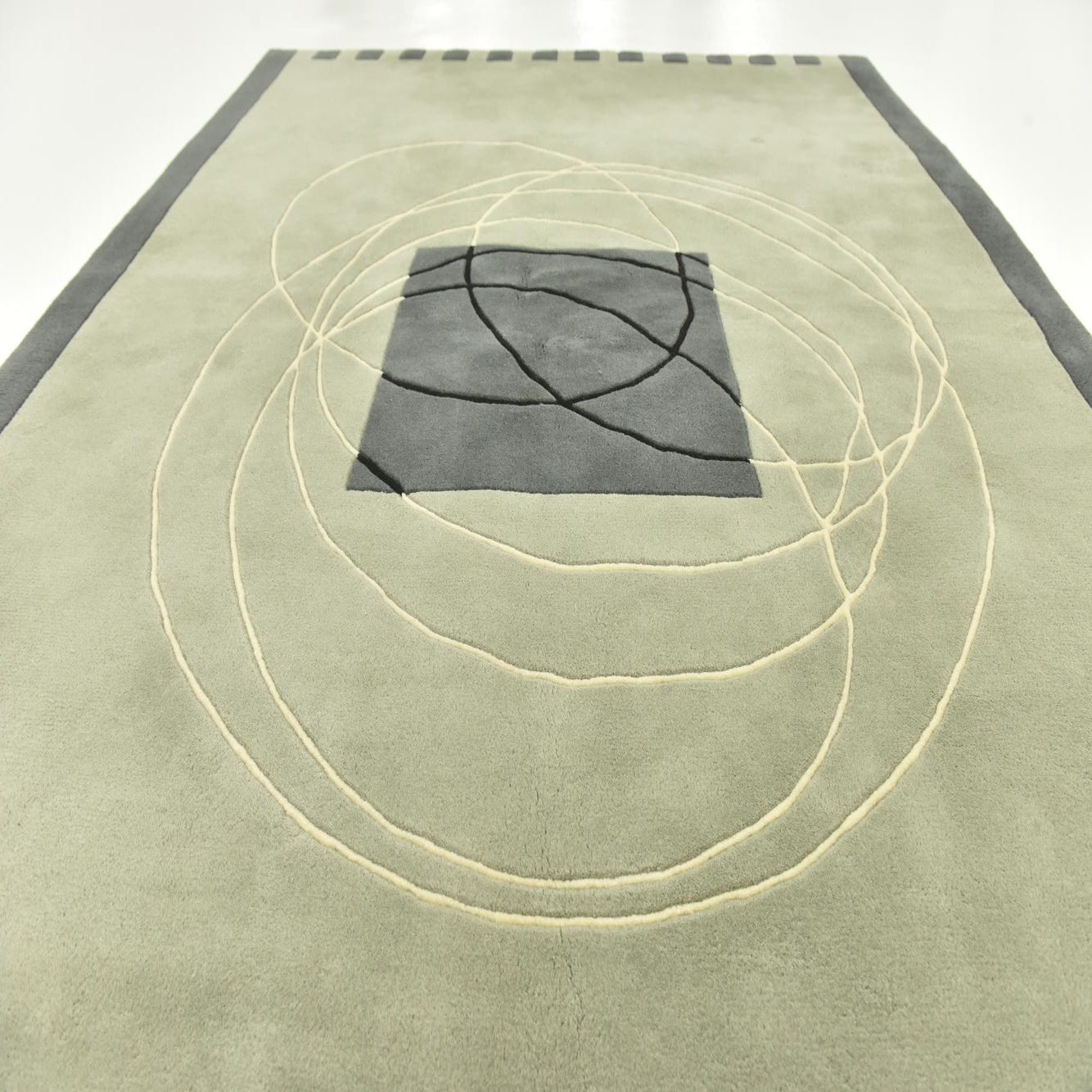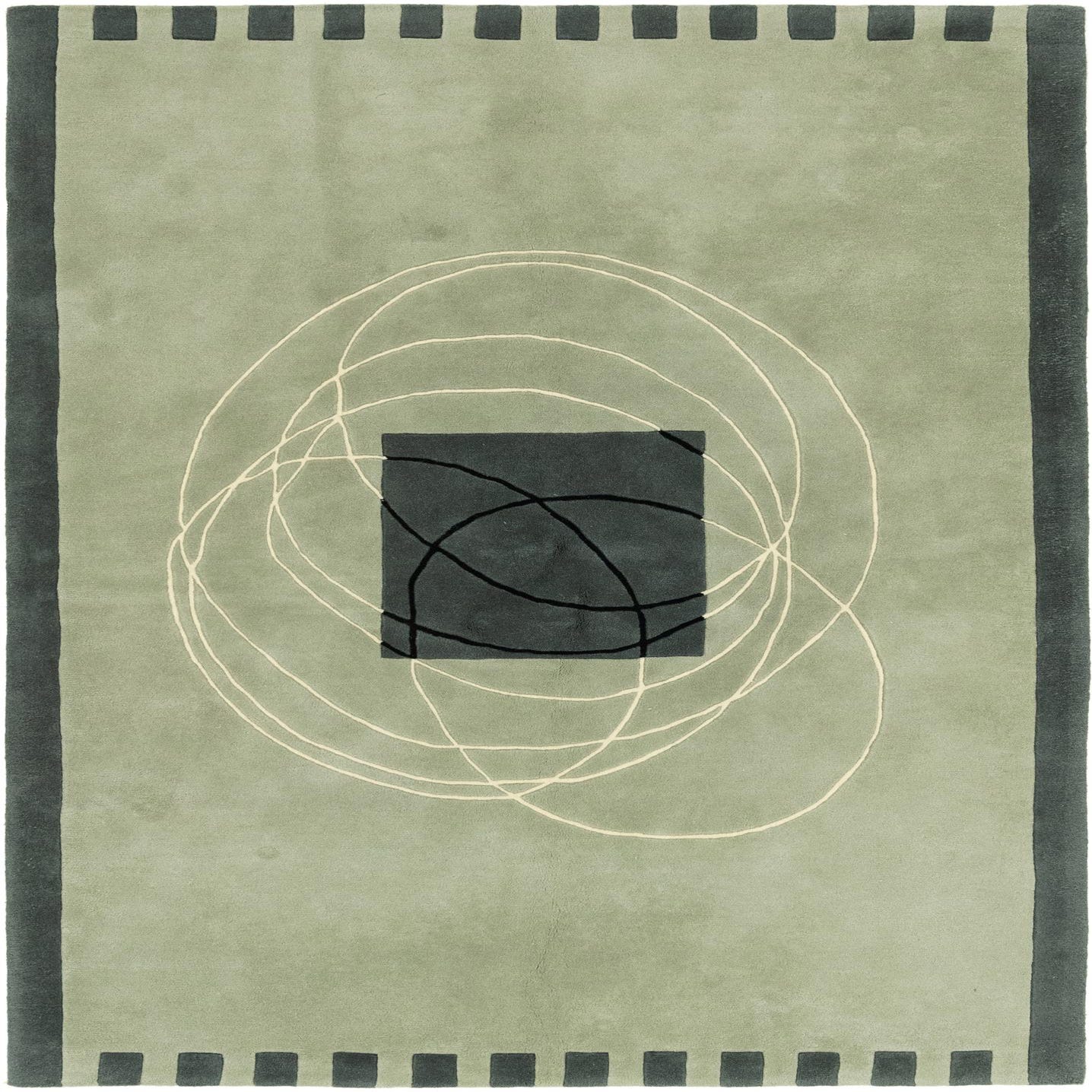 A soft light gray field provides a calm, velvety backdrop for a modern abstract composition. A charcoal-gray square centers the design, overlaid with looping ivory lines and bold black arcs that intersect with a hand-drawn quality. Dark gray side borders and a row of small square motifs at the top and bottom frame the piece, creating a balanced, geometric edge that contrasts the loose, circular center. Hand-tufted of 100% wool, the rug has a plush, tactile pile that feels warm underfoot while keeping the pattern crisp and defined.
