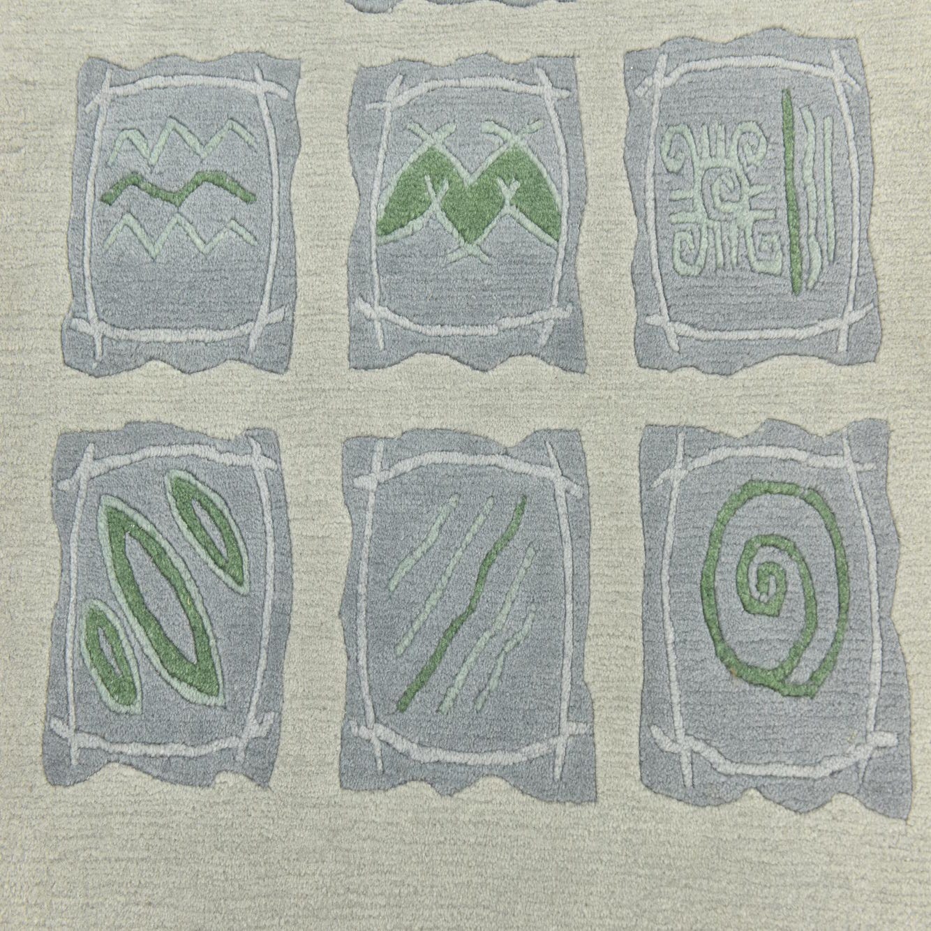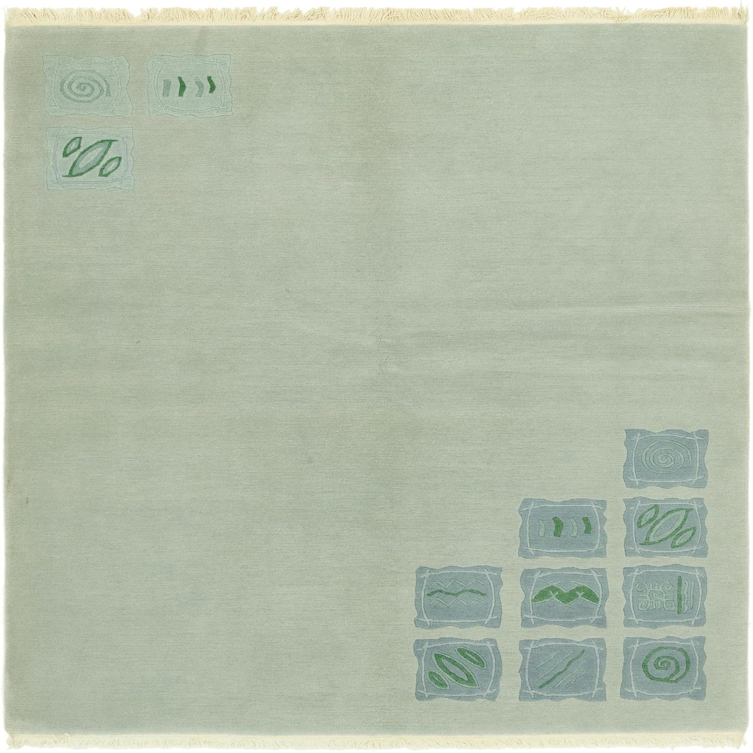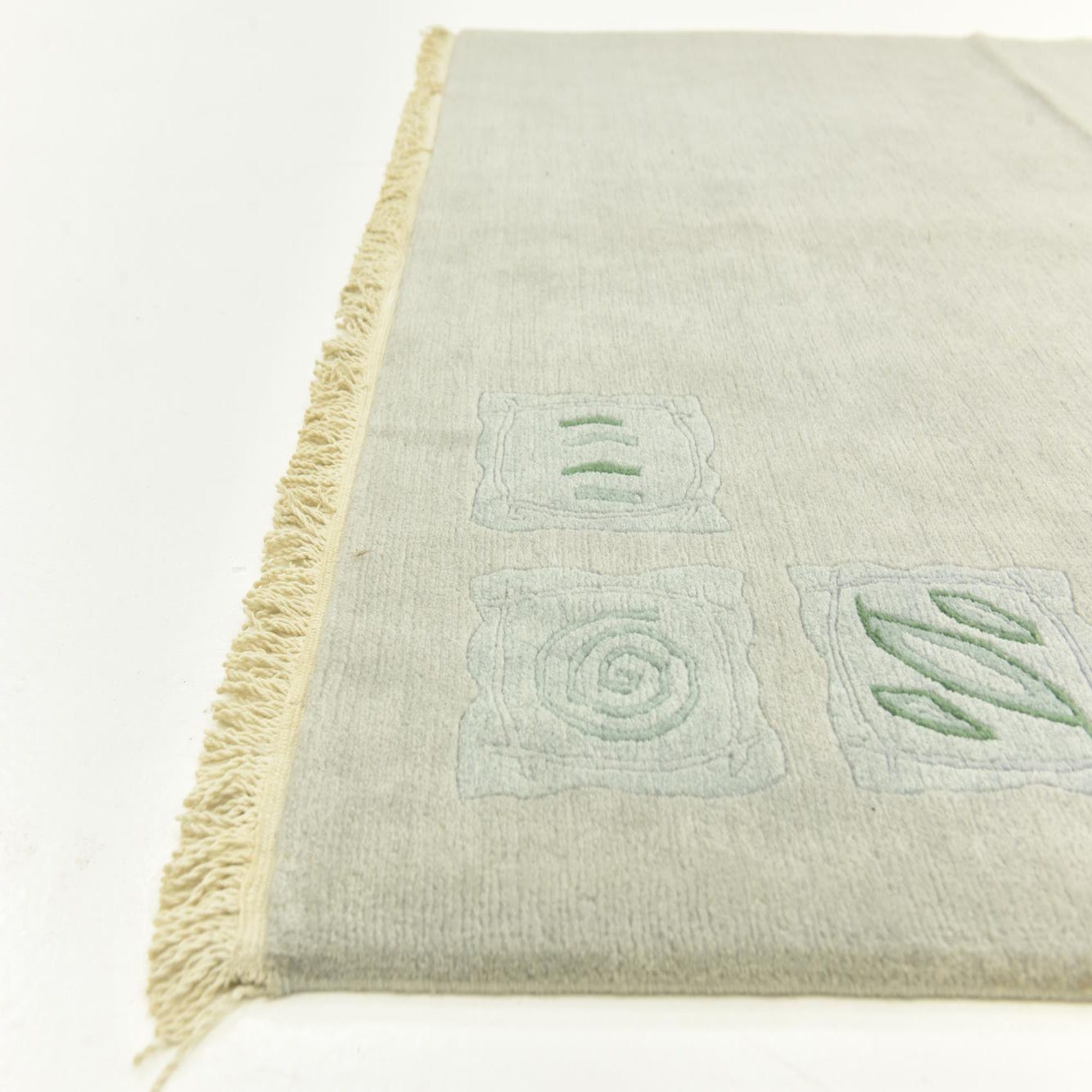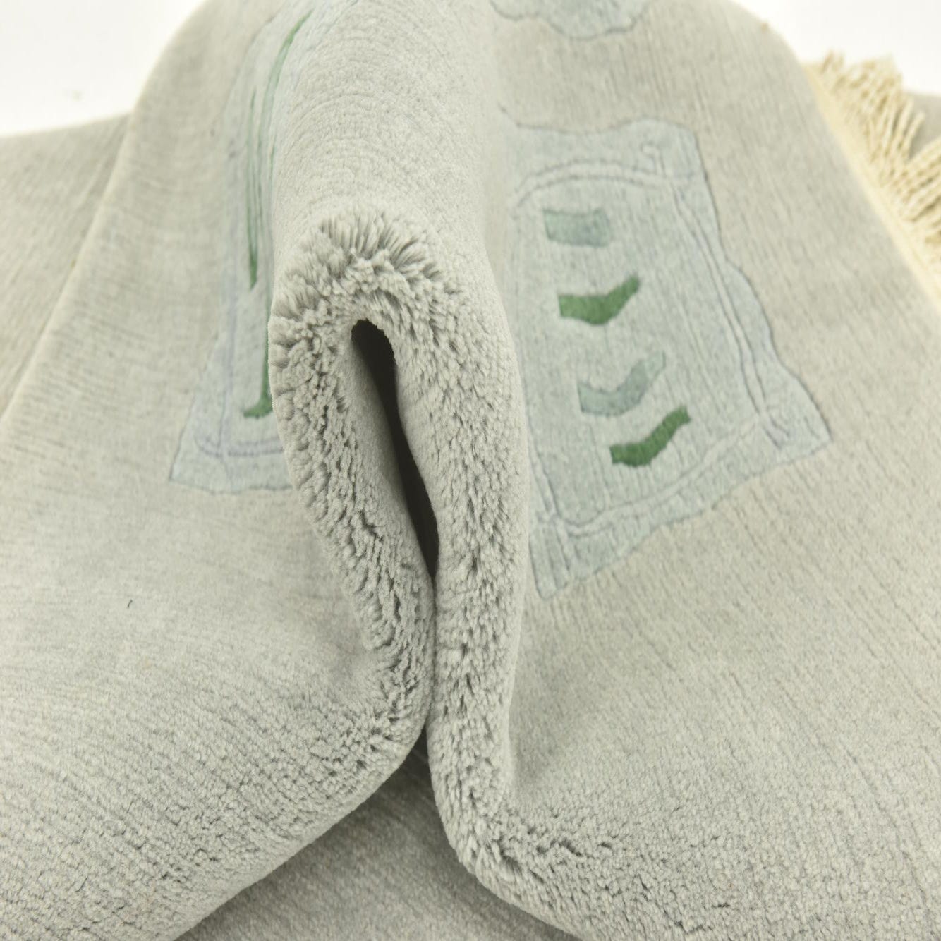 The Nepal collection rug is a hand-knotted 6x9 piece crafted from 100% wool, reflecting a dedication to quality and longevity. The rug features a light gray background that provides a serene and neutral canvas for the subdued pattern that adorns it. Further enhancing the design is a series of abstract motifs expressed in a palette of light blue and green, offering a gentle contrast without overwhelming the senses.