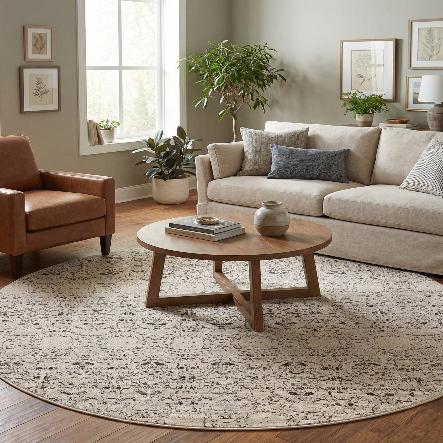 Place this rug under a small round dining table or a coffee table to anchor a conversational seating area, or layer it in a bedroom to soften hard flooring and define a reading nook. Its neutral palette pairs well with warm wood tones, linen upholstery, and metal accents, making it a natural fit for transitional, Scandinavian, or modern farmhouse interiors where a muted, lived-in look is desired.