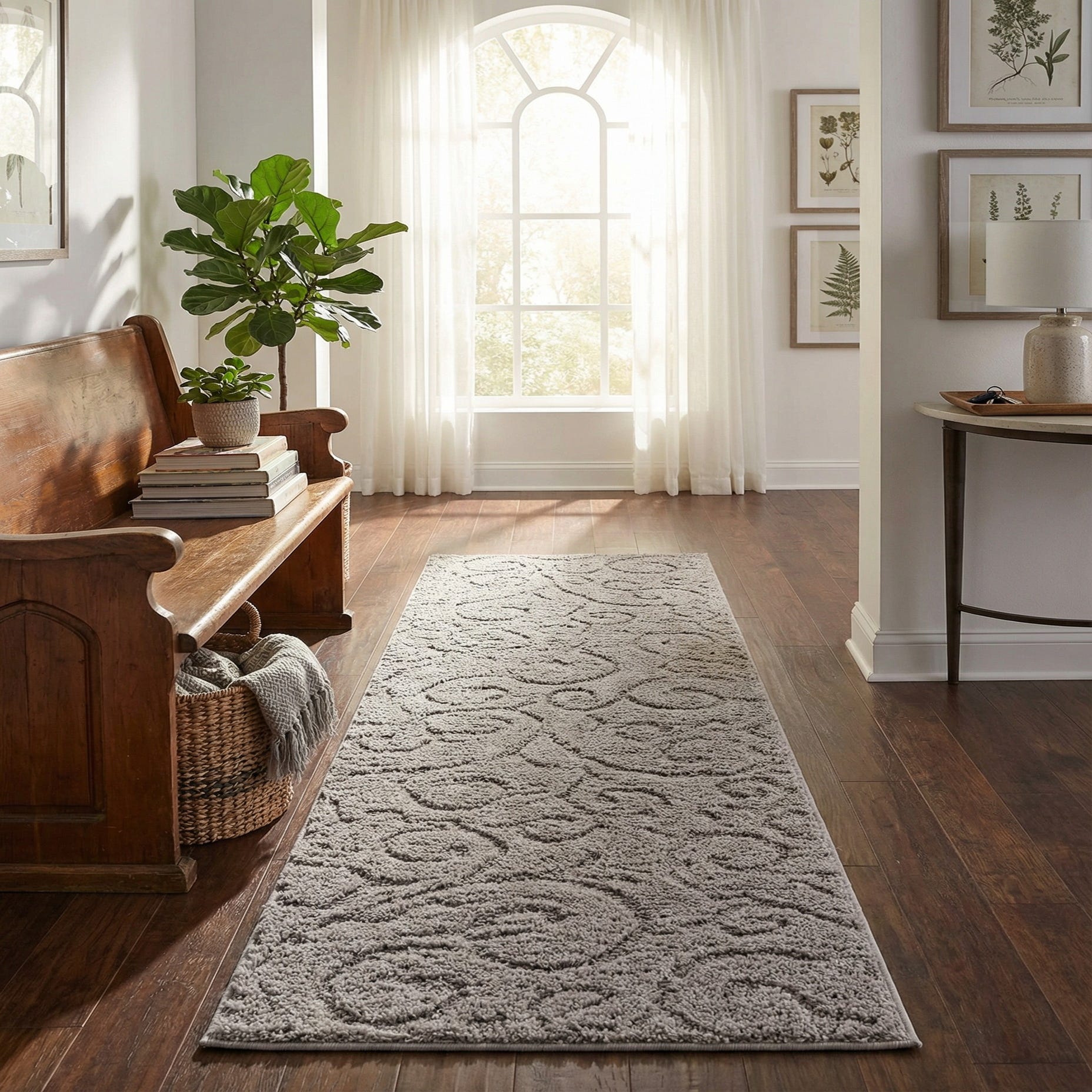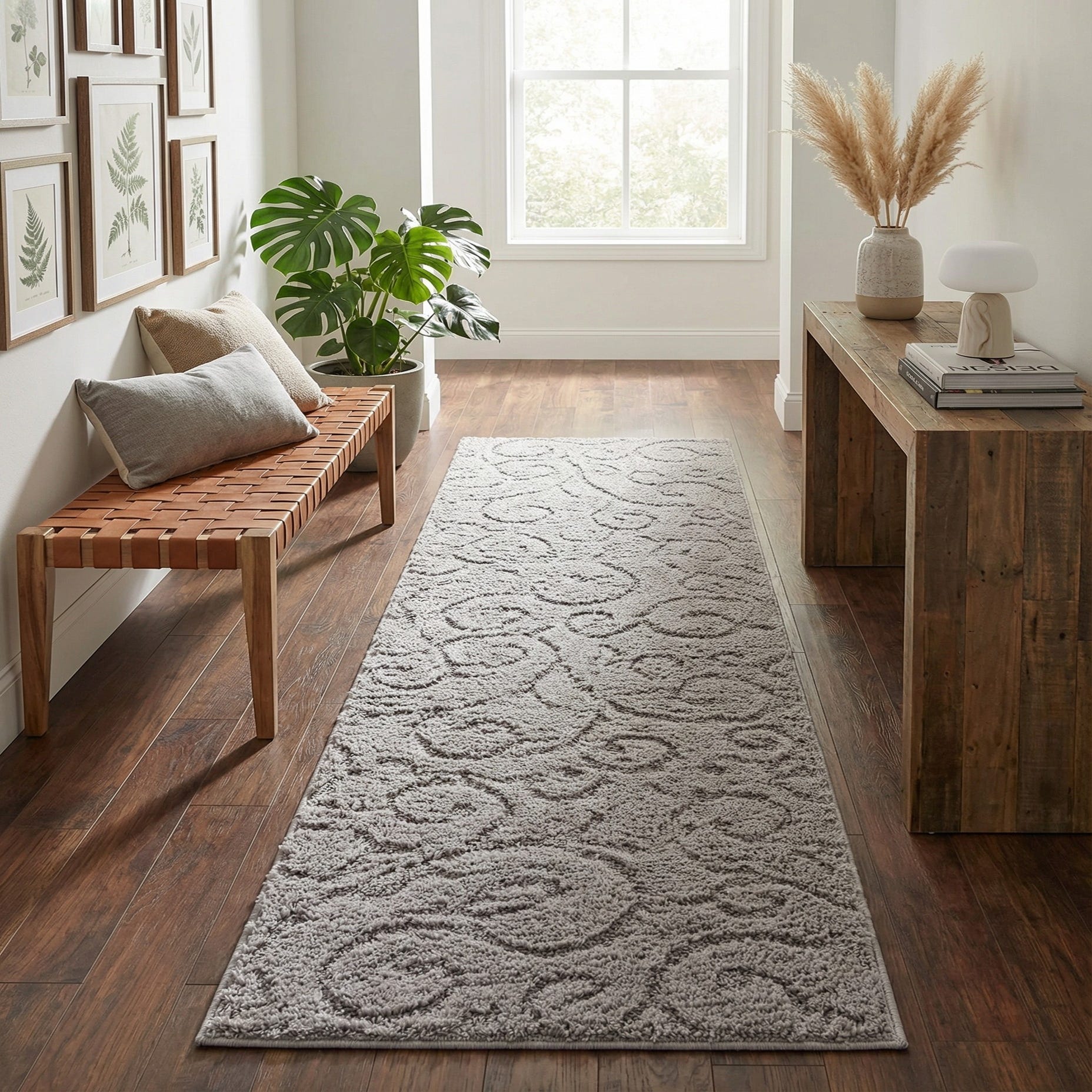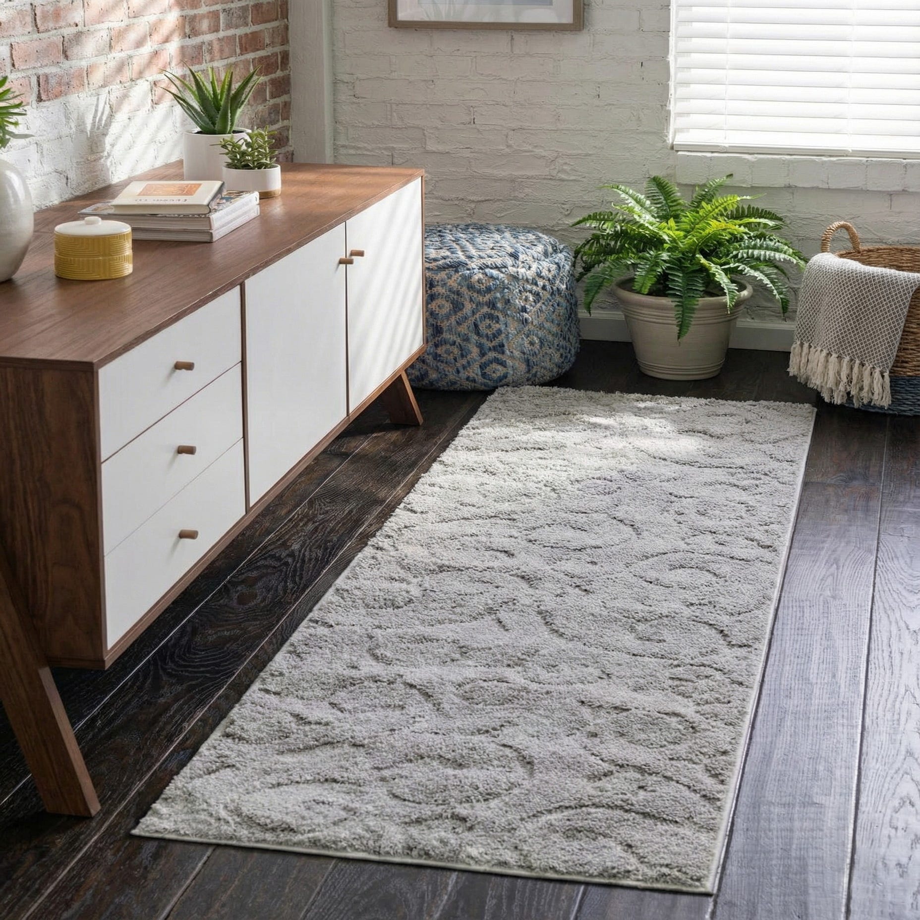Soft, tone-on-tone scrolls and botanical swirls are carved into a thick shag surface, giving this runner subtle depth and a tactile, plush feel underfoot. The light gray background provides a calm, neutral base while slightly darker pile contours define the looping pattern, creating soft shadowing and visual interest without high contrast. Machine-made from 100% polyester, the rug delivers a dense, cushiony texture that’s comfortable to walk on and pleasing to touch.