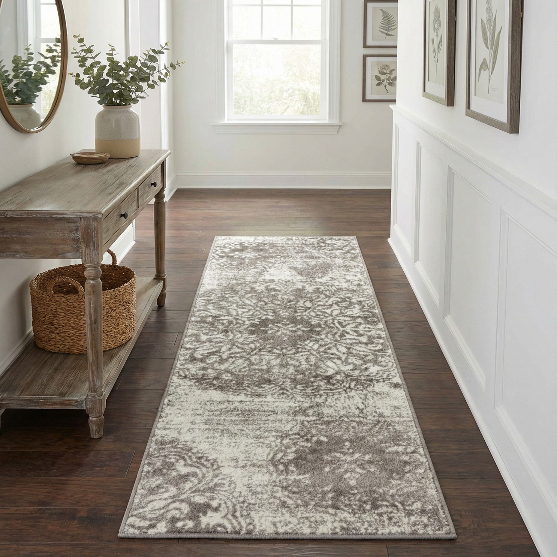 A soft, tonal pattern brings classic ornament into a modern context: faded medallion and floral motifs in ivory rest against a light gray background, creating an all-over, gently distressed look. Machine-made from 100% polypropylene, the surface has a low-to-medium plush pile with a subtle sheen that feels soft underfoot while showing the pattern with a slightly raised texture.