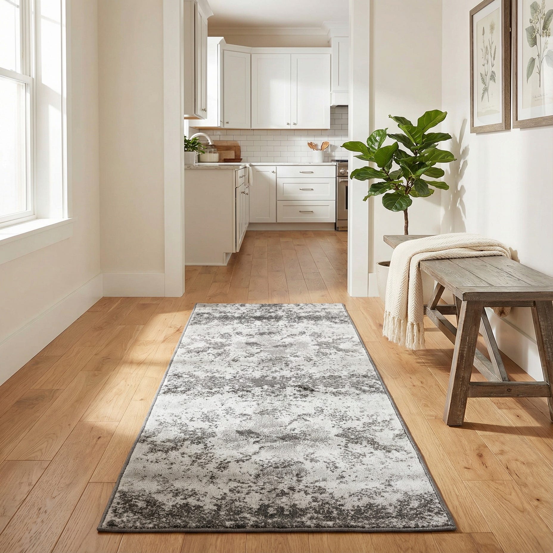 This runner works well in transitional and contemporary spaces where neutral layers are key: line a hallway, anchor a narrow kitchen, or place along the side of a bed to add quiet pattern without overwhelming the room. It pairs naturally with cool-toned palettes, matte metals, and natural woods, and also complements minimalist and Scandinavian interiors that favor muted contrasts and tactile surfaces.