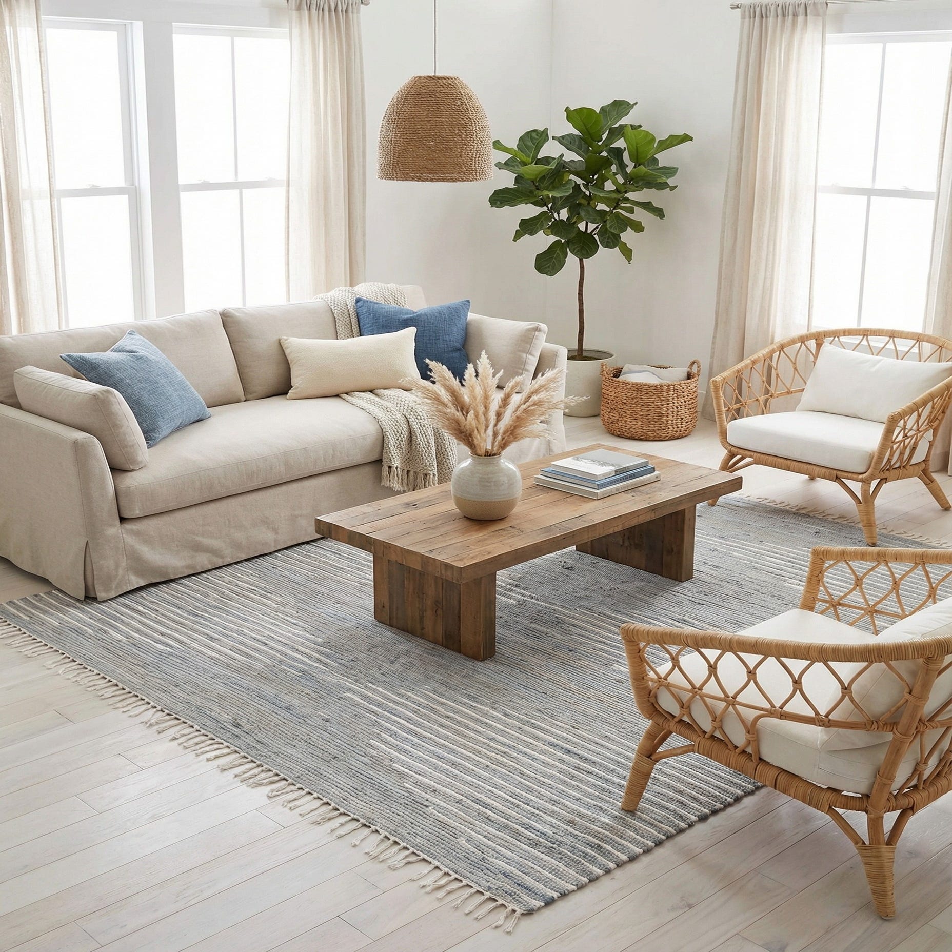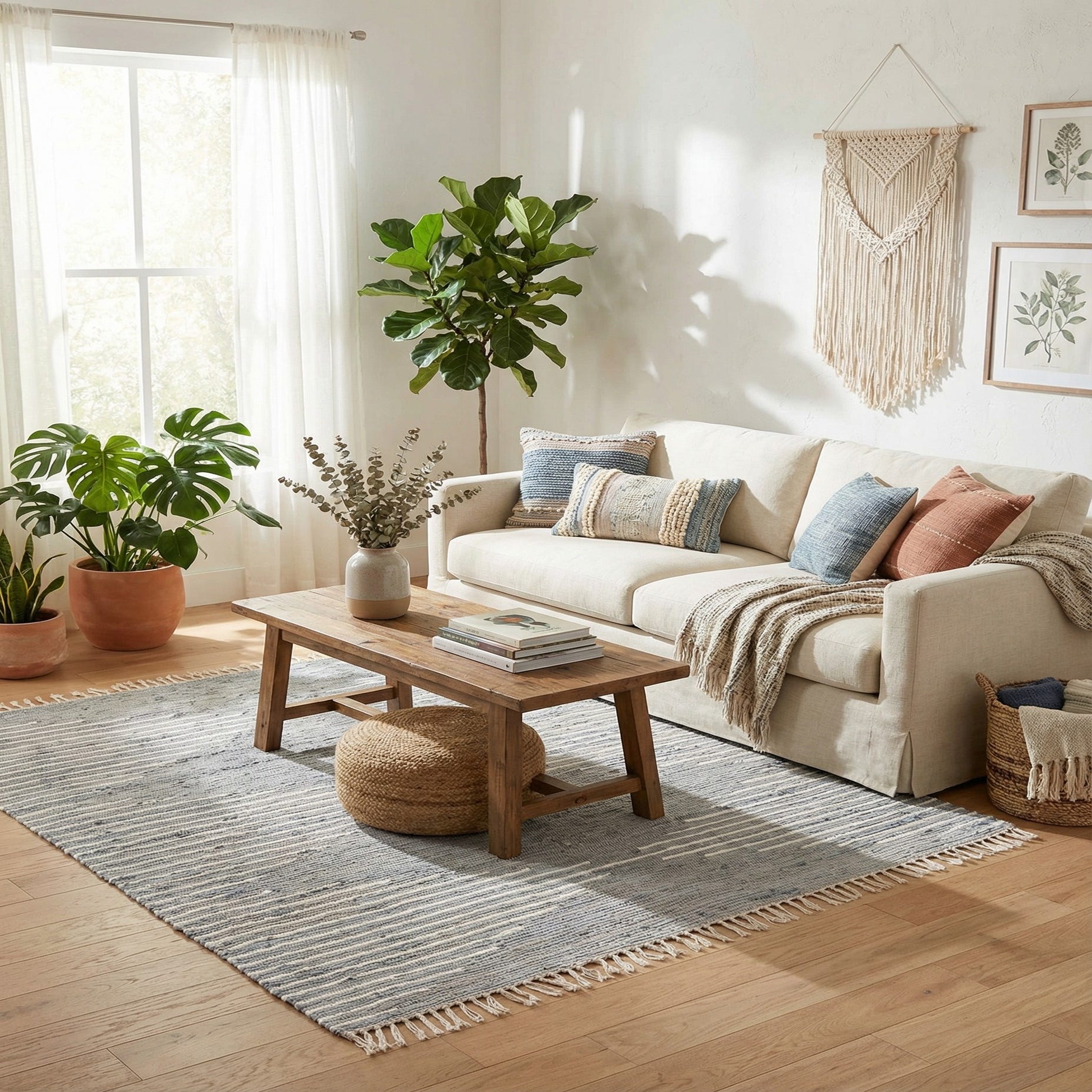 The surface is low-profile and tactile—soft cotton with slight slub and tonal flecks that you can feel beneath bare feet. Its neutral palette and clean lines work well in Scandinavian, coastal, or modern farmhouse interiors. Use it to anchor a seating group, layer it in a bedroom for extra texture, or place it in an entry or sunroom to add a cozy, lived-in touch.