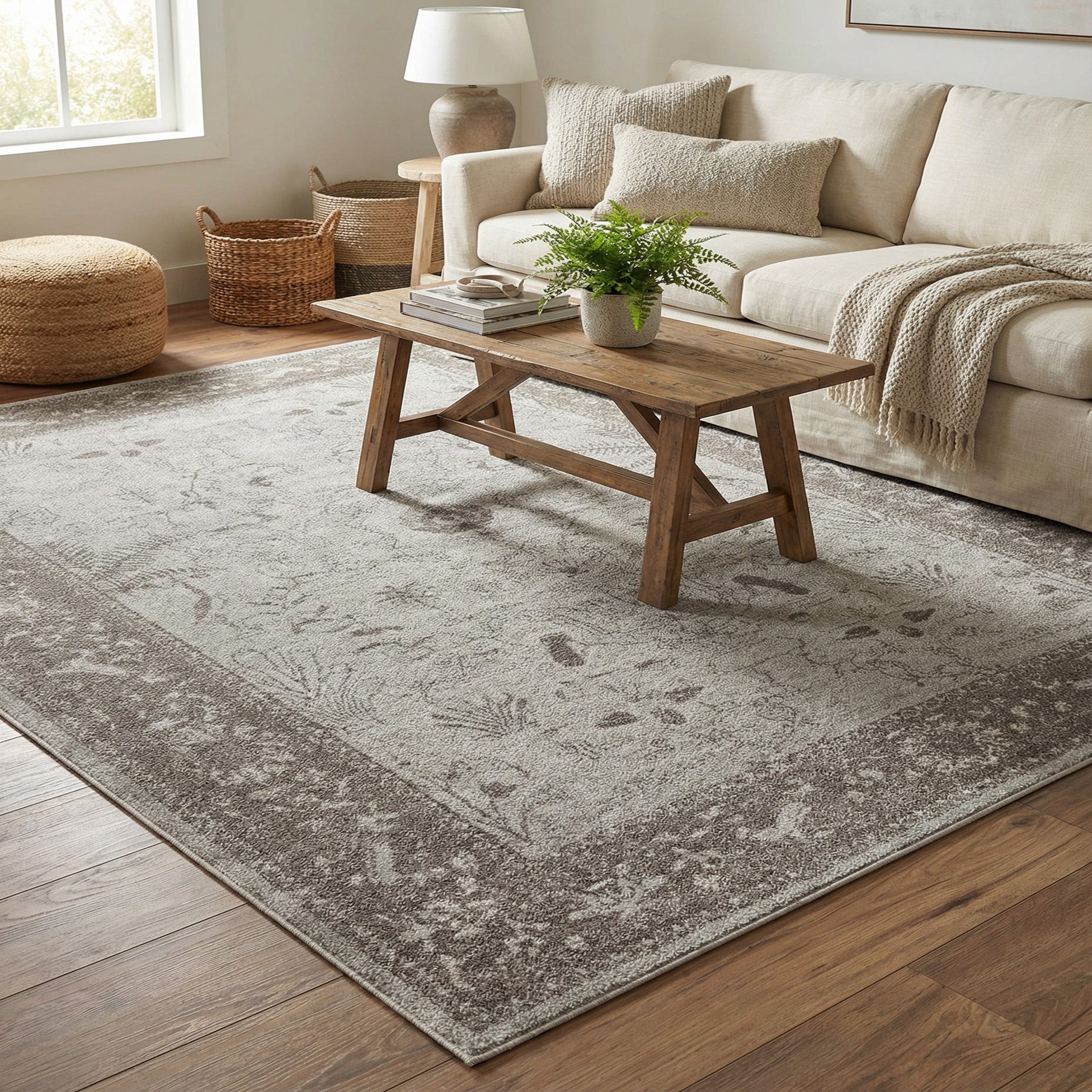 A soft, light gray field sets a quiet backdrop for an antique-inspired medallion and scrolling vine pattern worked in deeper gray tones. Fine floral sprigs, ferns and small ornamental motifs fill the center while a contrasting gray border frames the composition with denser, folk-inspired detailing. The overall effect is a gently distressed, traditional design with a muted, tonal palette that brings pattern without overpowering a room.