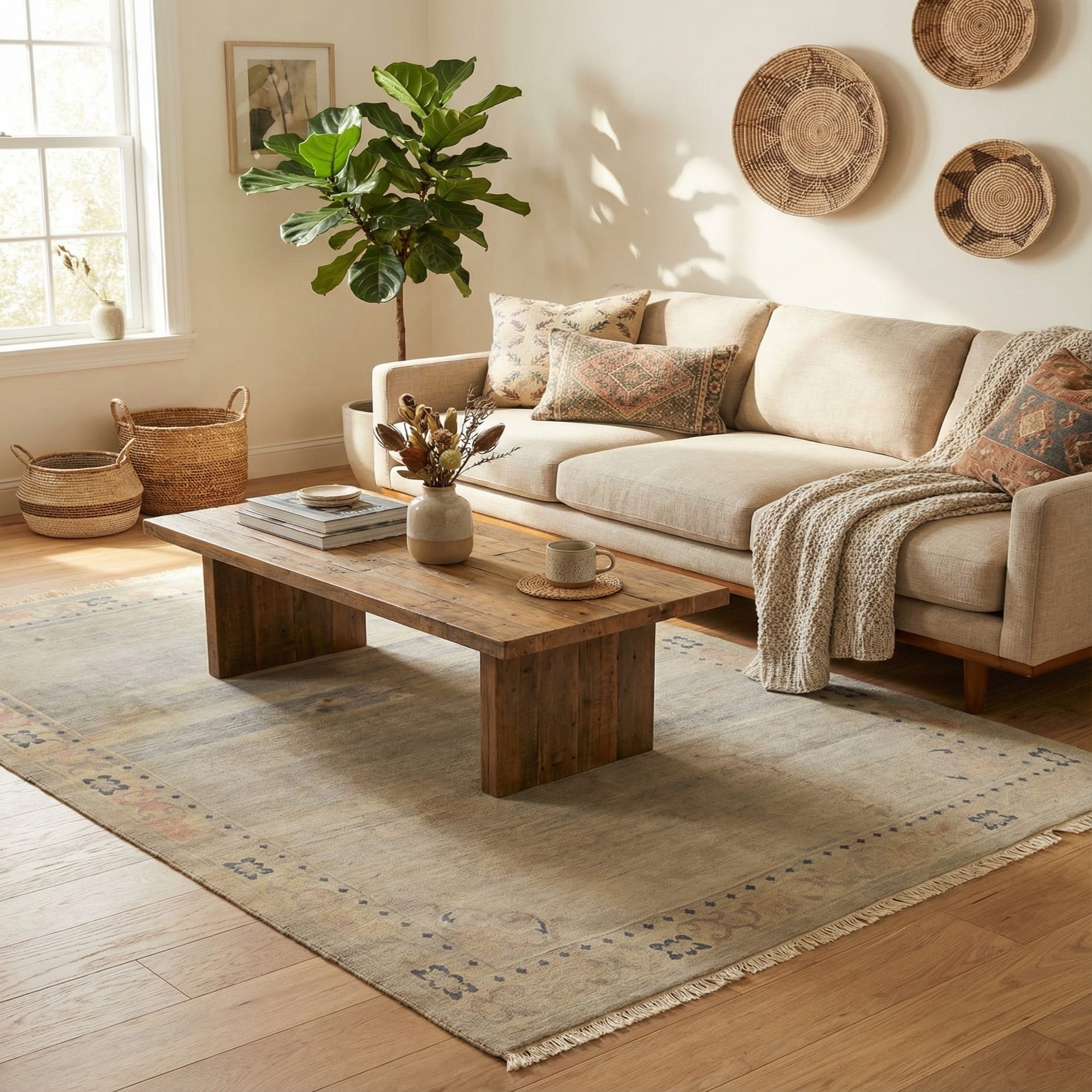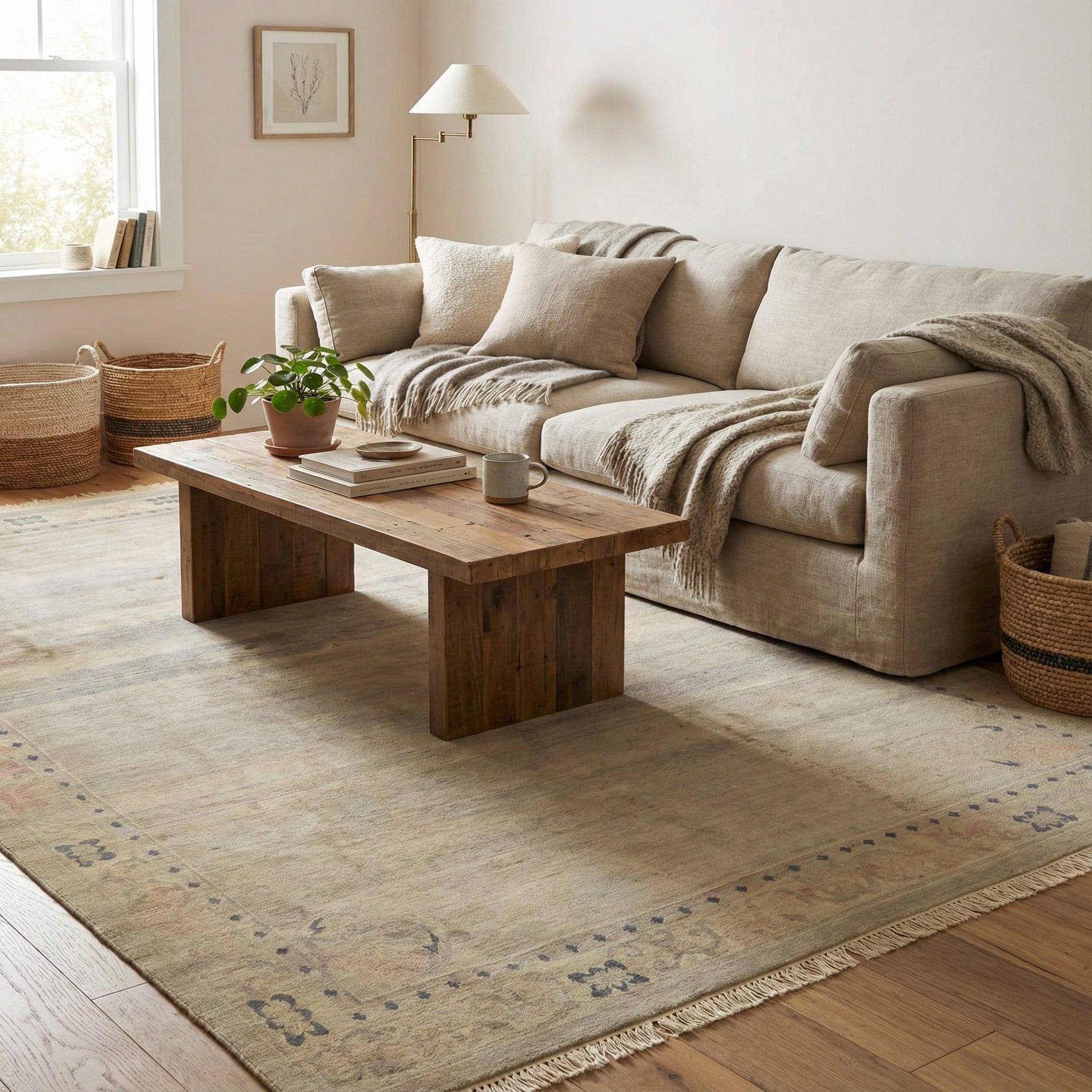 The rug’s muted palette and understated pattern make it versatile across styles. Place it beneath a sofa and coffee table to soften a contemporary living room, layer it at the foot of a bed in a serene bedroom, or use it to ground a cozy reading nook with leather and brass accents. It pairs particularly well with warm woods, linen upholstery and neutral décor schemes in transitional, Scandinavian, coastal or modern farmhouse interiors, bringing a calm, collected presence to the space.