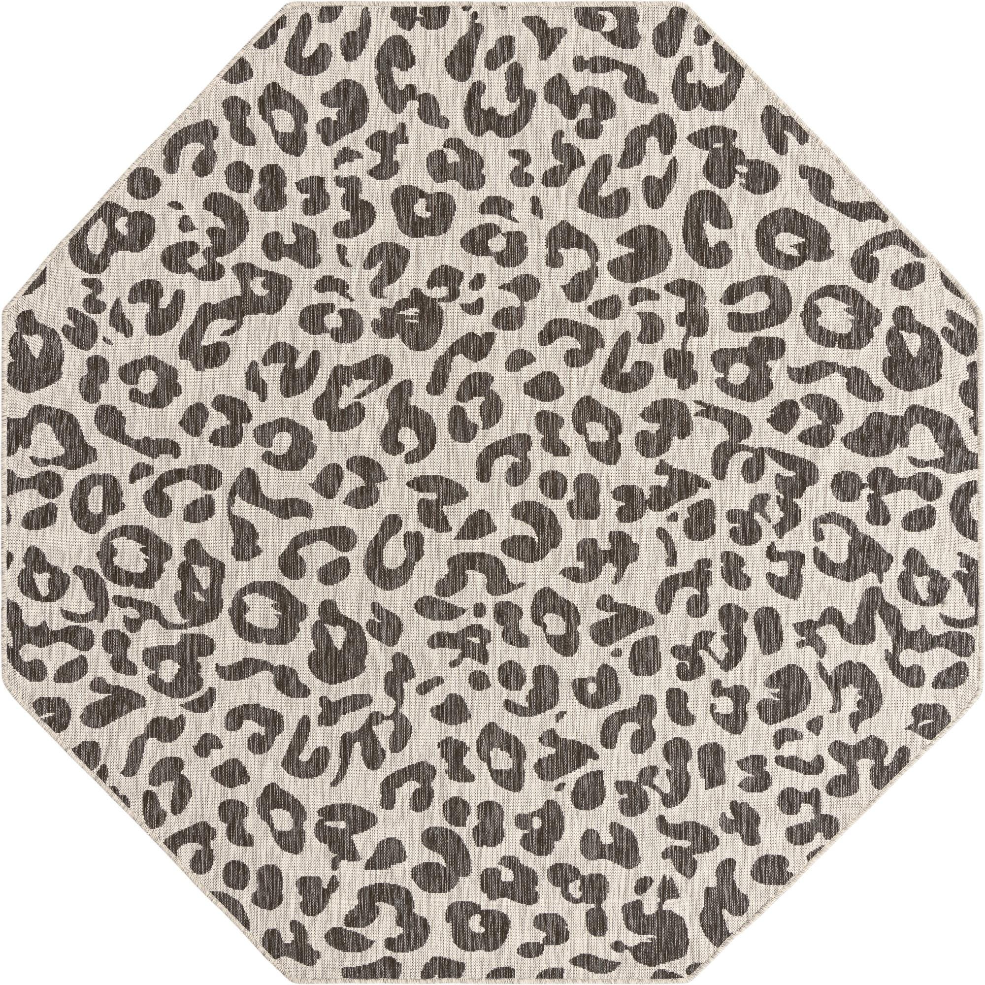 Octagon-shaped outdoor rug with a modern gray and silver leopard print pattern, suitable for a patio.