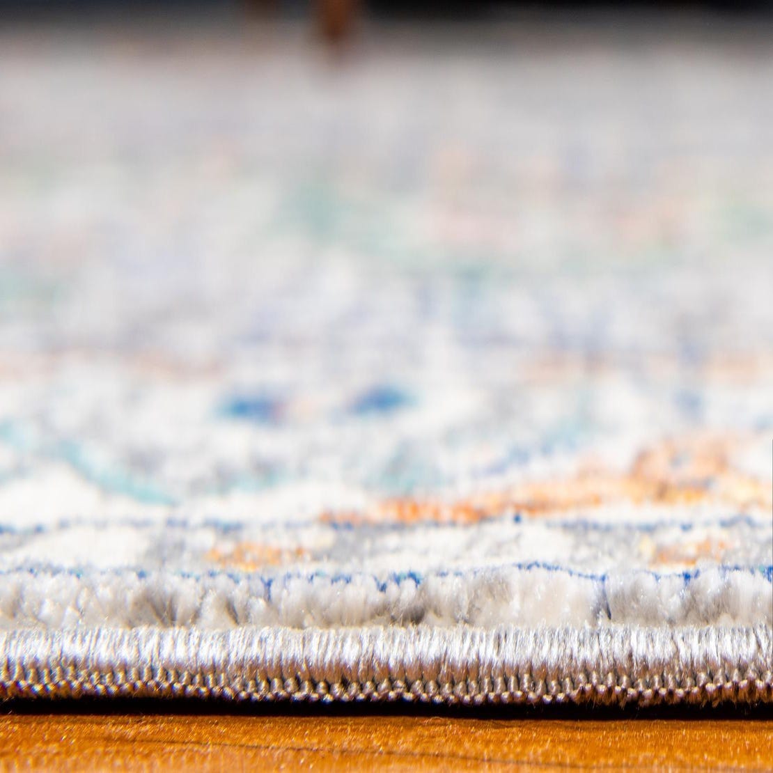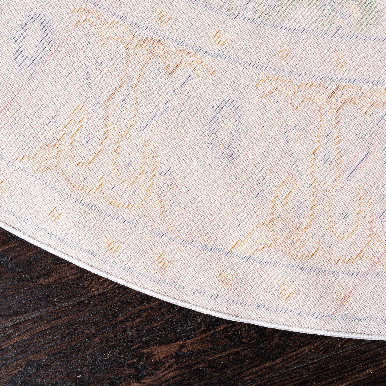 A soft, low-profile pile in 100% polyester presents a pared-back take on a traditional medallion rug. The light gray background frames an open, slightly distressed field of floral and arabesque motifs in blue, gold, green, red, and pink, while a decorative border adds a refined edge. Running your hand across the surface reveals a smooth, even texture with just enough variation to give the pattern a gently aged look without bulk.