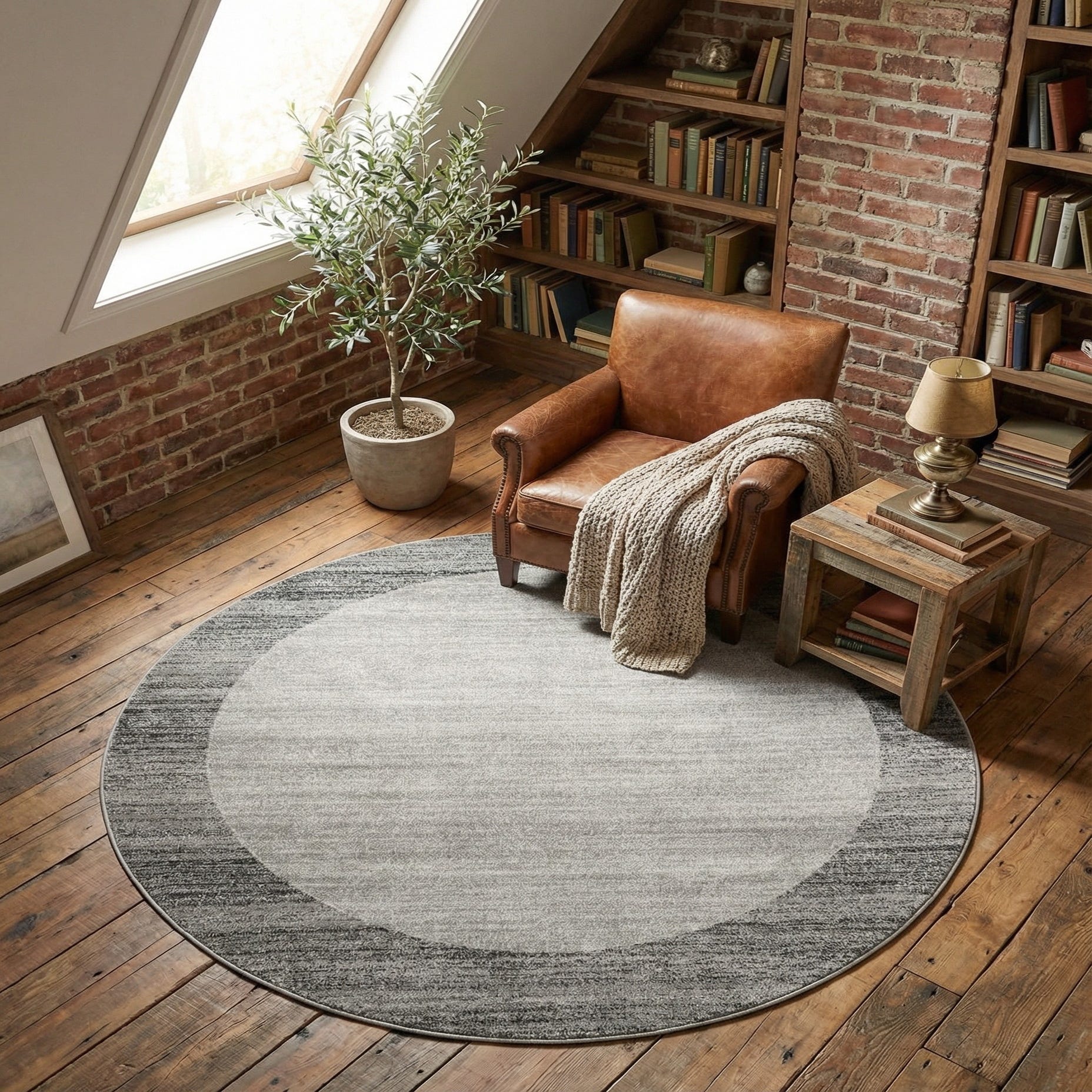 A round rug with a clean, modern profile: a soft light gray field is framed by a wider gray band with fine tonal striations, while subtle beige accents warm the overall palette. The pattern is minimal and geometric, focusing on the contrast between the smooth central circle and the textured border. Machine made from 100% polypropylene, the construction yields a low, dense pile with a smooth, even surface and a slight, refined luster that feels comfortable underfoot.