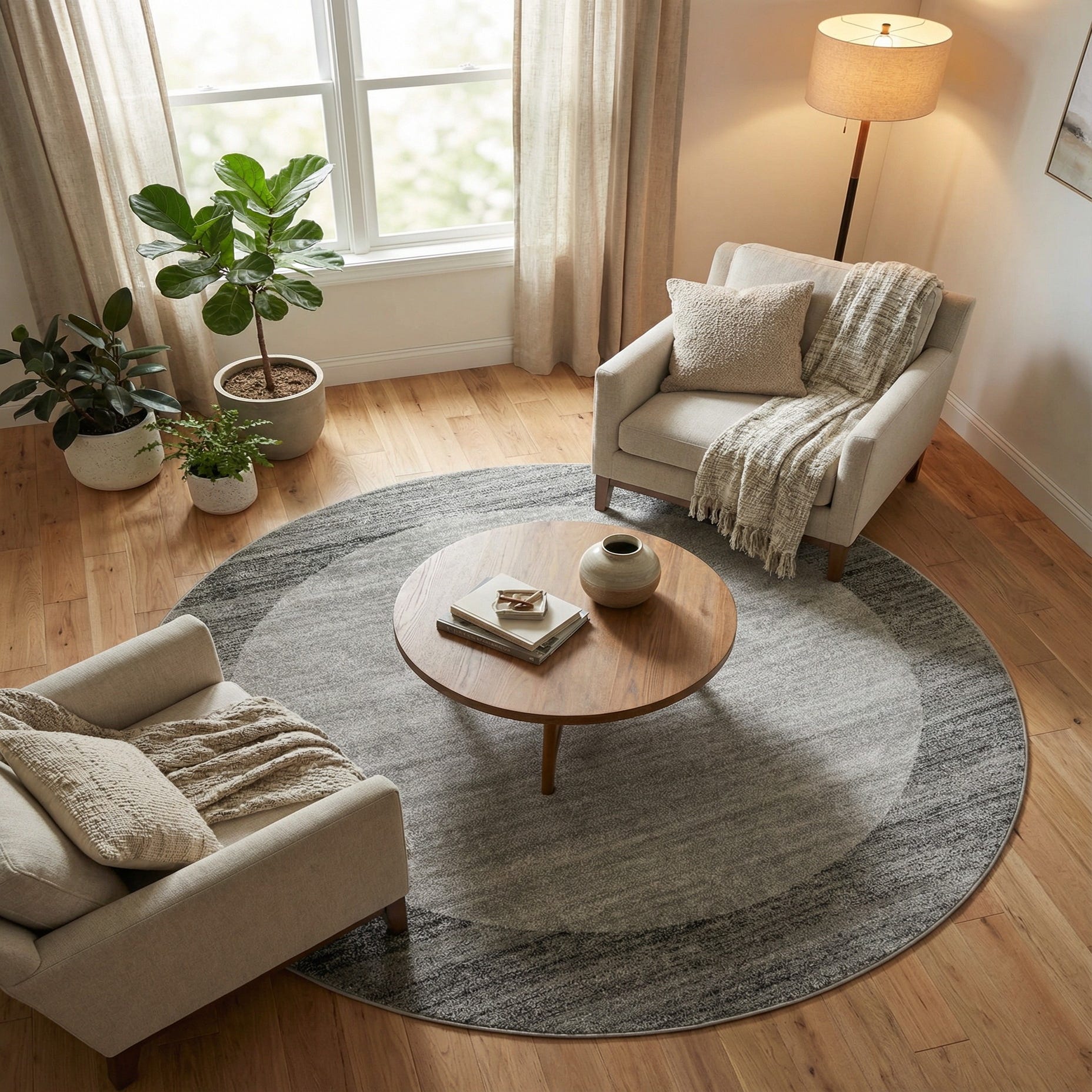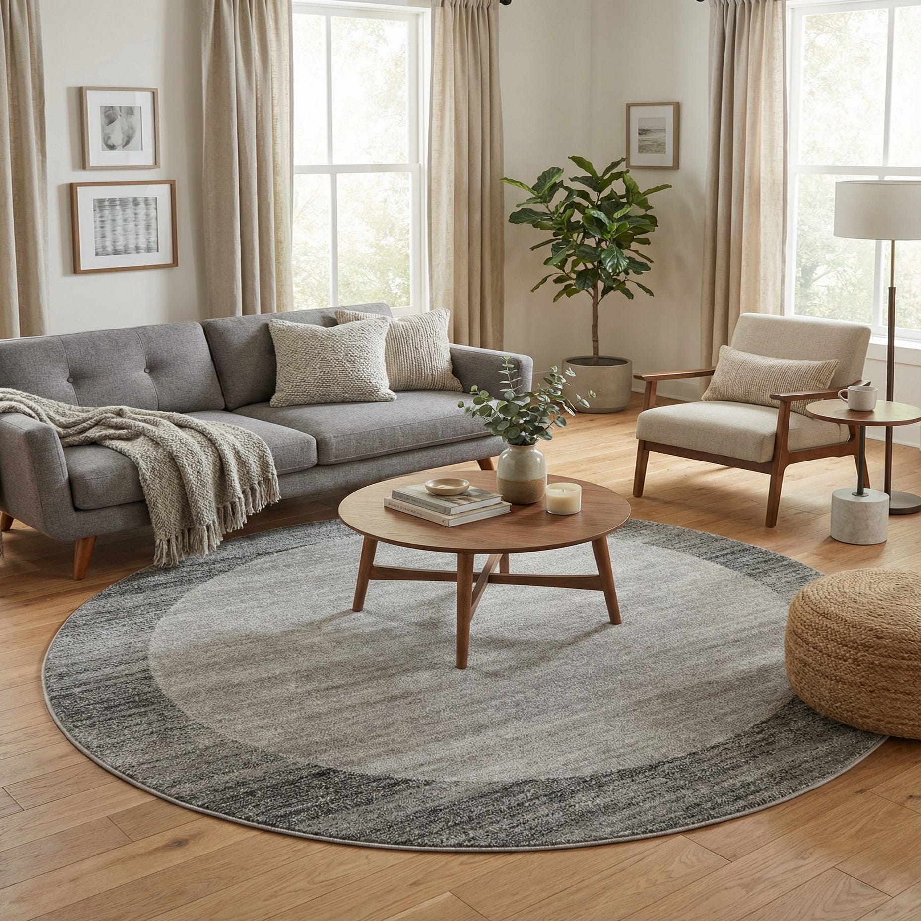 This piece works well beneath a round dining table, as the anchor for a compact seating group, or layered in a bedroom to add shape and balance. Pair it with light oak or ash furnishings, neutral linen upholstery, and matte black or brushed-metal accents for a modern Scandinavian or transitional look. It also complements warmer textures like leather and woven baskets, bringing a restrained, versatile foundation to contemporary interiors.