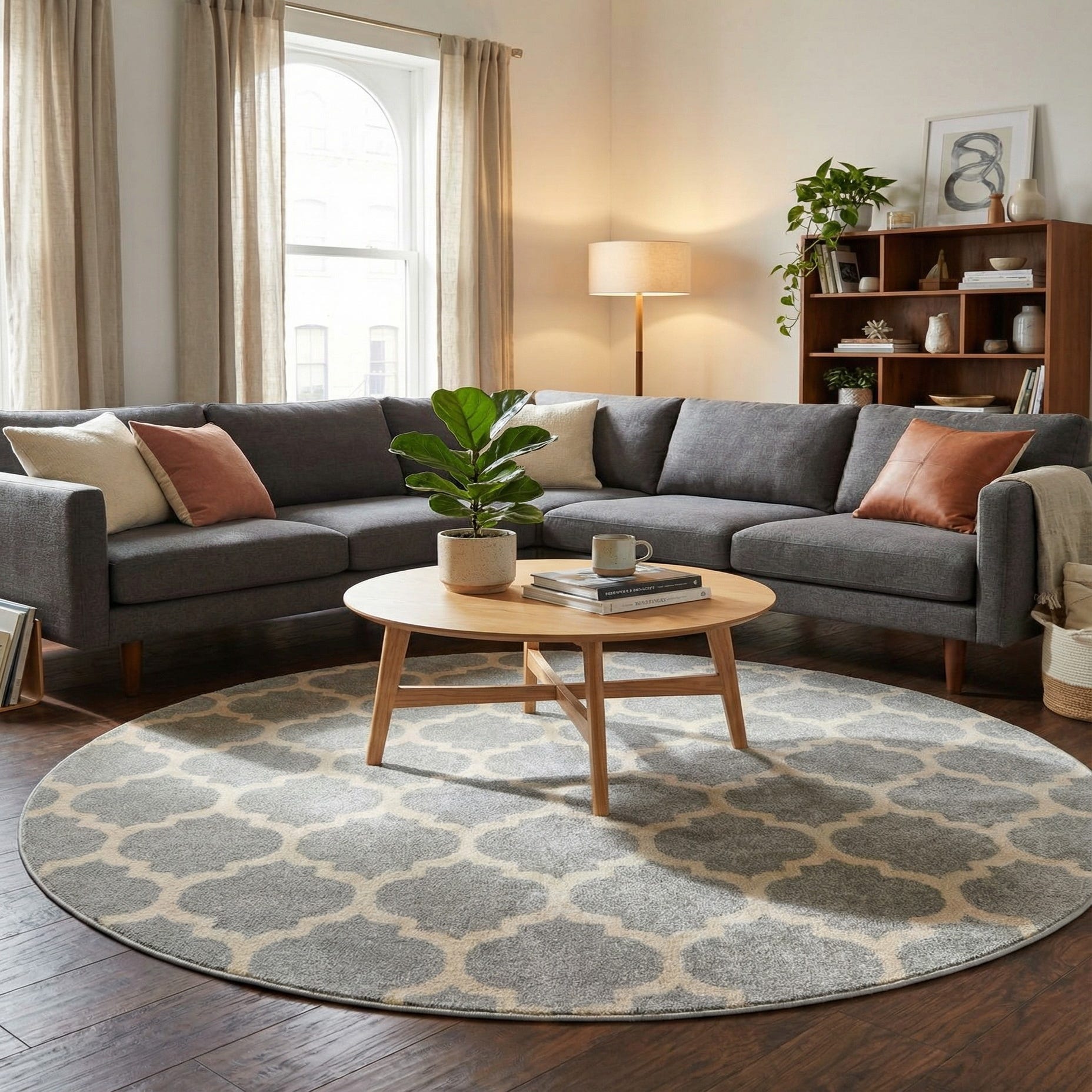 The round shape is well-suited to anchor a seating area beneath a coffee table, add softness to a bedroom seating nook, or bring subtle pattern to a breakfast corner or entry. It pairs nicely with light wood finishes, crisp whites and neutrals, or deeper accent colors like navy and charcoal for contrast, and works equally well in contemporary, transitional, or casual traditional interiors.