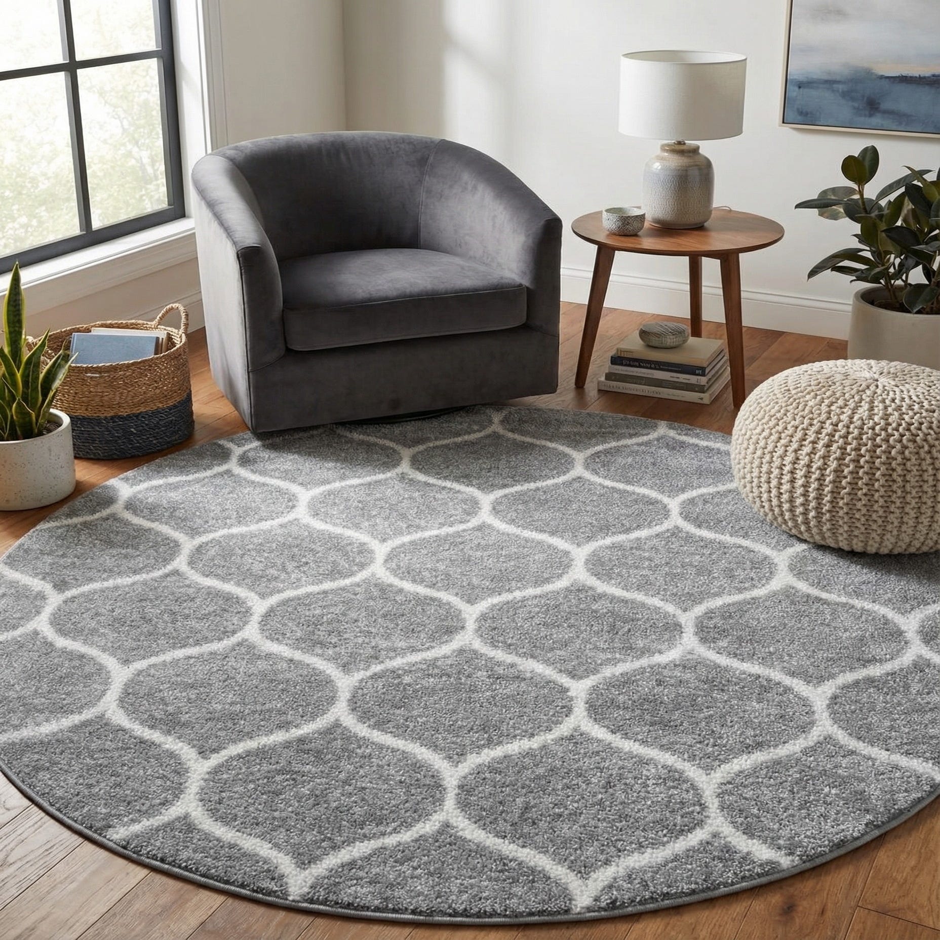 This round shape works well to define a seating area or anchor a circular dining table, and it pairs naturally with contemporary, transitional, or coastal-inspired interiors. Layer it under light-wood furniture and cool metal accents for a clean, airy look, or introduce textured throws and pillows in muted pastels or charcoal to create a calm, cohesive scheme. The neutral light gray and ivory palette makes it easy to integrate into living rooms, bedrooms, or open-plan spaces where you want subtle pattern and soft underfoot texture.