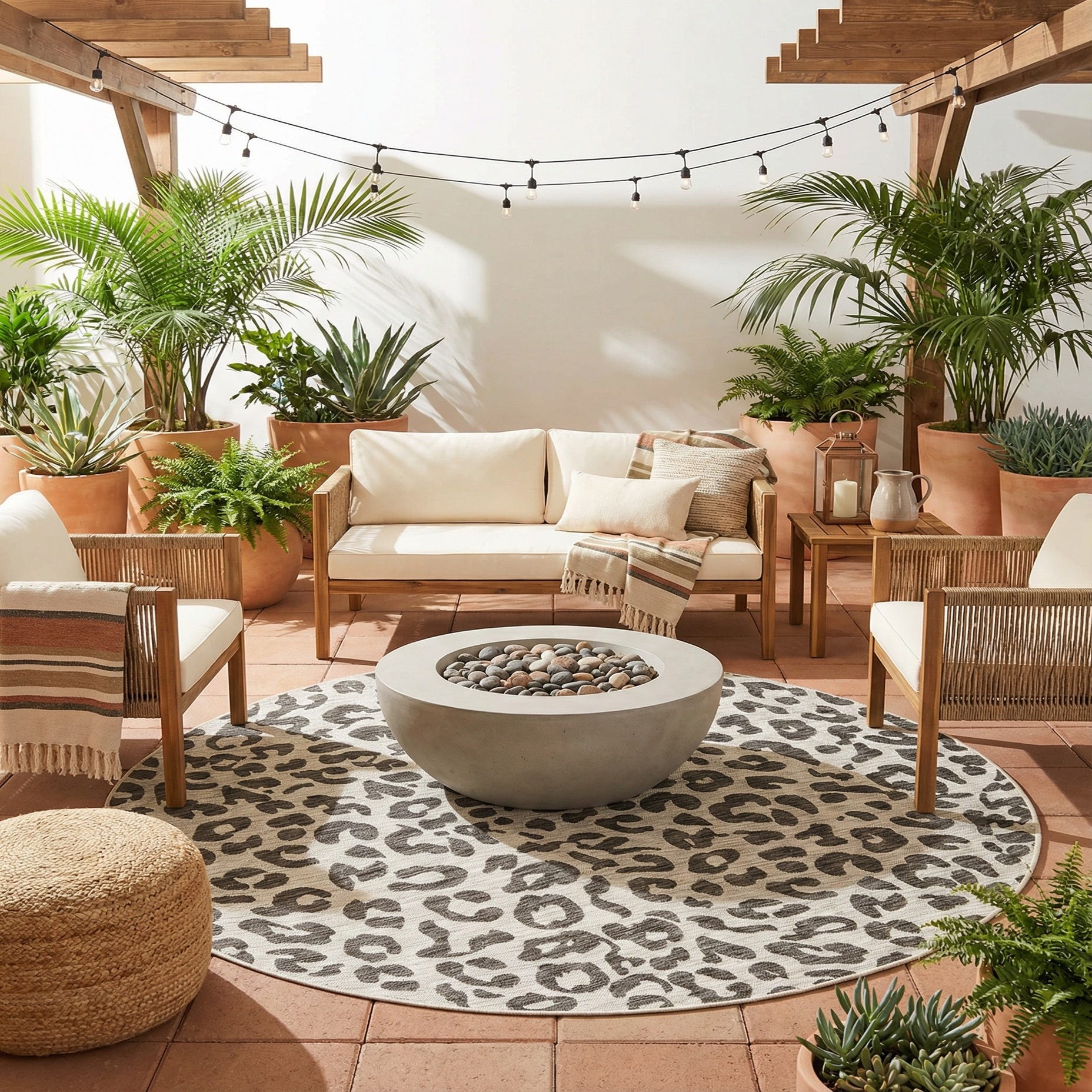 Place this rug on a covered patio or sunroom to add pattern without overwhelming a space, or use it in a casual living room or bedroom to anchor seating with a graphic yet understated touch. It pairs well with natural woods and woven textures, black or metal accents, and soft neutral upholstery; consider it under a round bistro table or centered beneath a small seating grouping to introduce movement and visual interest.