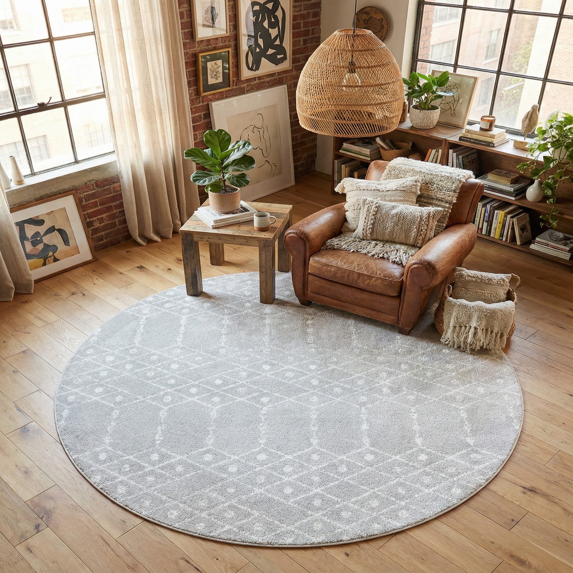 Machine-made from 100% polypropylene, the rug has a low-profile, slightly plush pile with a faint sheen and a subtly raised pattern you can feel when you run your hand across it. Its understated texture and shape make it well suited to a round dining area, a cozy living room grouping, or centered beneath a bed to ground a neutral bedroom. It also pairs nicely with light woods, cool metal accents, and soft linen or cotton upholstery for a contemporary, Scandinavian, or transitional look.