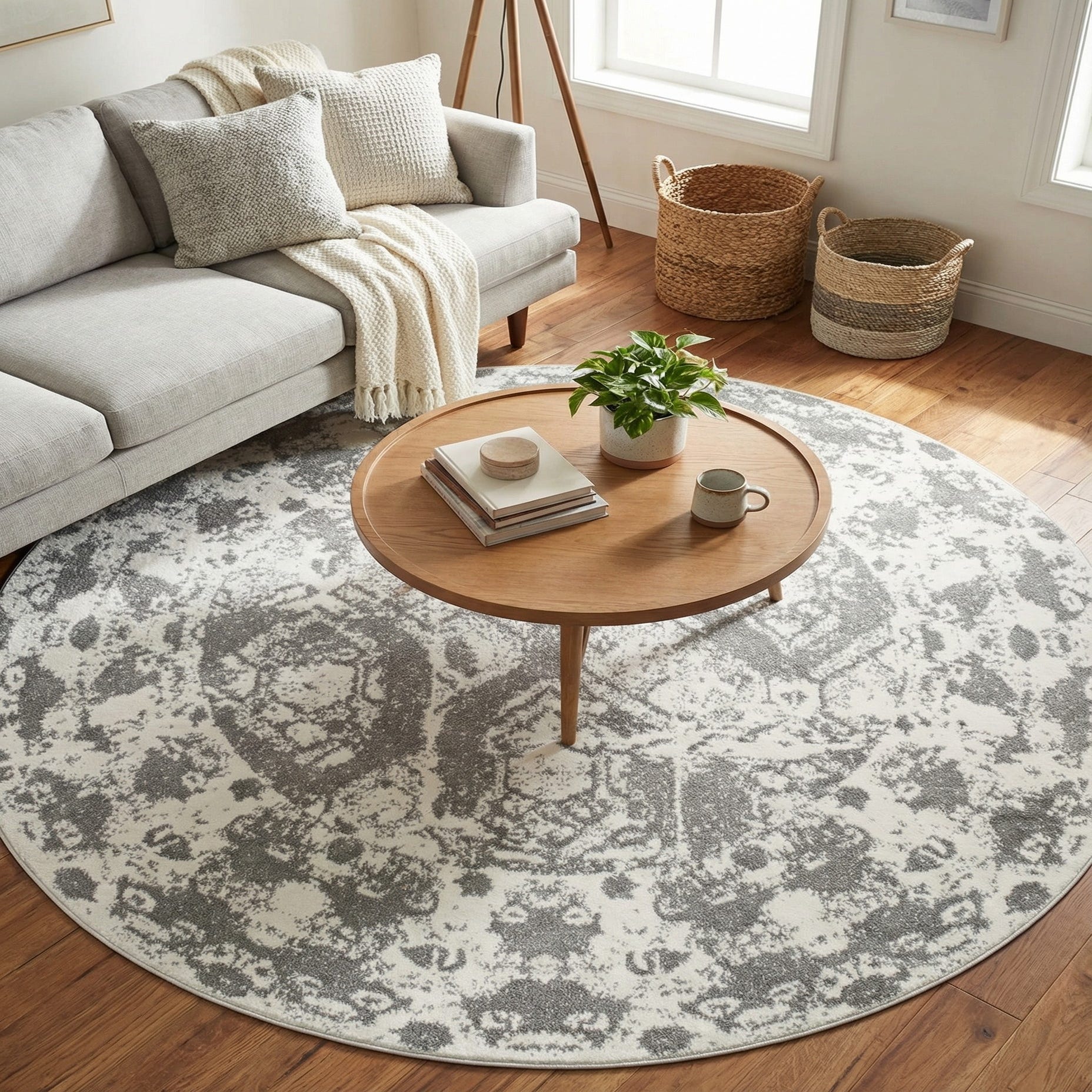 This rug works well as a neutral anchor in a range of interiors—from a cozy conversation nook or round dining setup to a minimalist bedroom or entry. The light gray and ivory palette pairs naturally with warm wood tones, crisp white furnishings, or cool metal finishes, and complements both muted and layered color schemes.