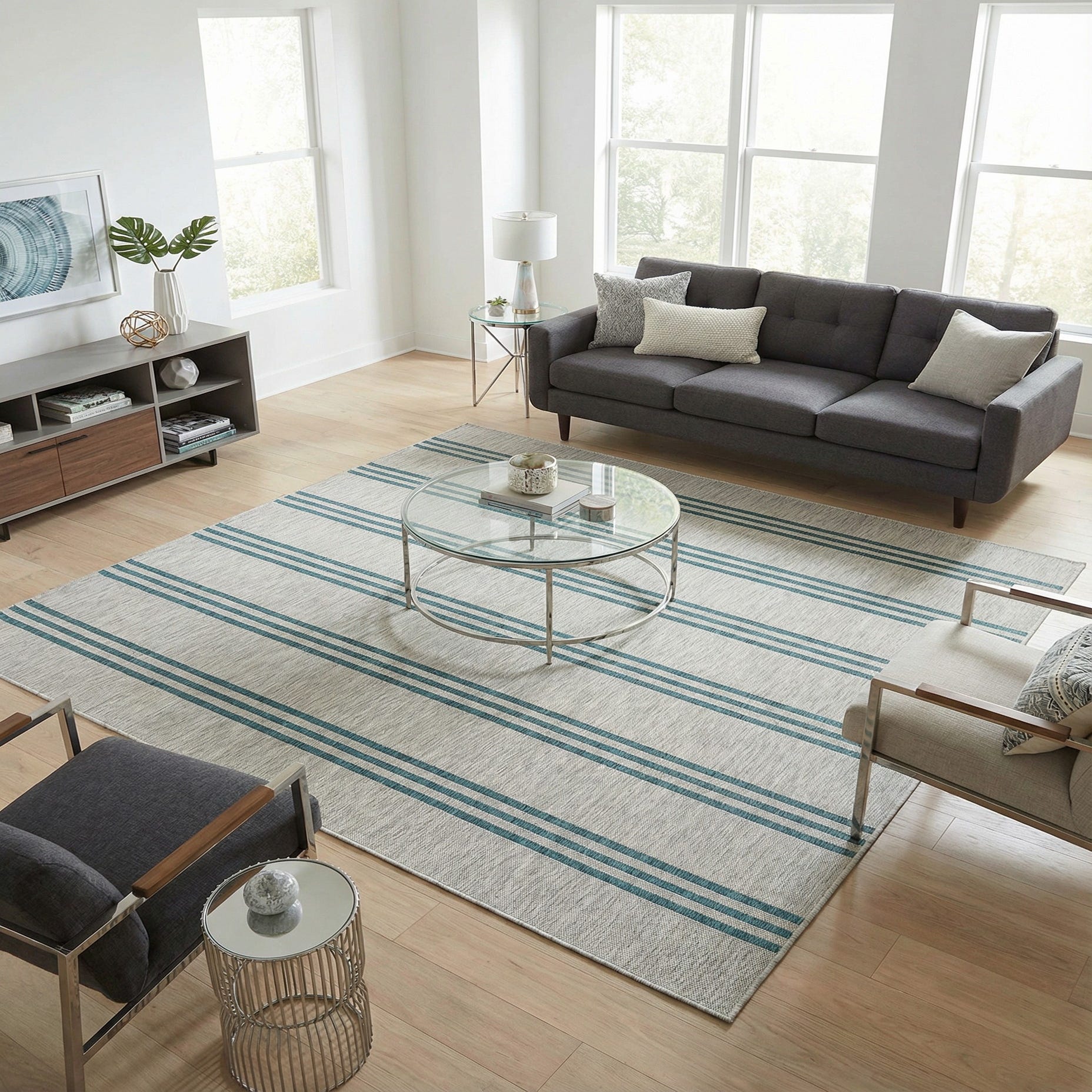 In terms of decor, this rug would serve well in modern, coastal, or Scandinavian-inspired spaces, flawlessly aligning with minimalist aesthetics while adding a touch of color. Its understated elegance works particularly well on patios, decks, dining areas, and in living rooms that embrace a sophisticated yet relaxed atmosphere.
