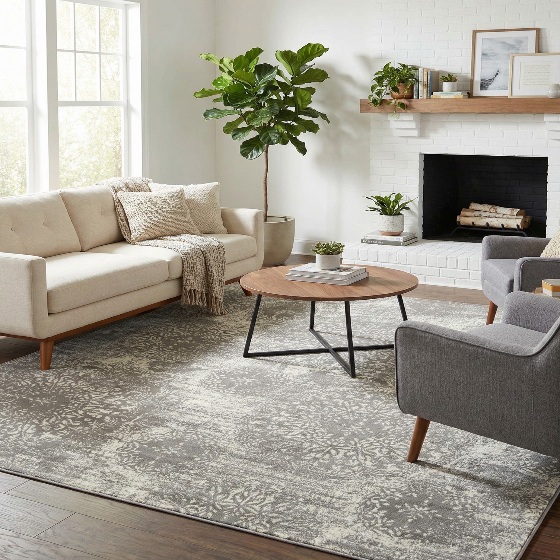 Soft to the touch yet structured underfoot, this machine-made rug is crafted from 100% polypropylene with a low, even pile. A light gray field provides a calm, neutral backdrop for ivory medallion motifs that appear gently distressed and layered, creating subtle depth and a slightly time-worn character. The overall effect balances traditional ornament with a modern, faded finish—an understated pattern that adds visual interest without overpowering a room.