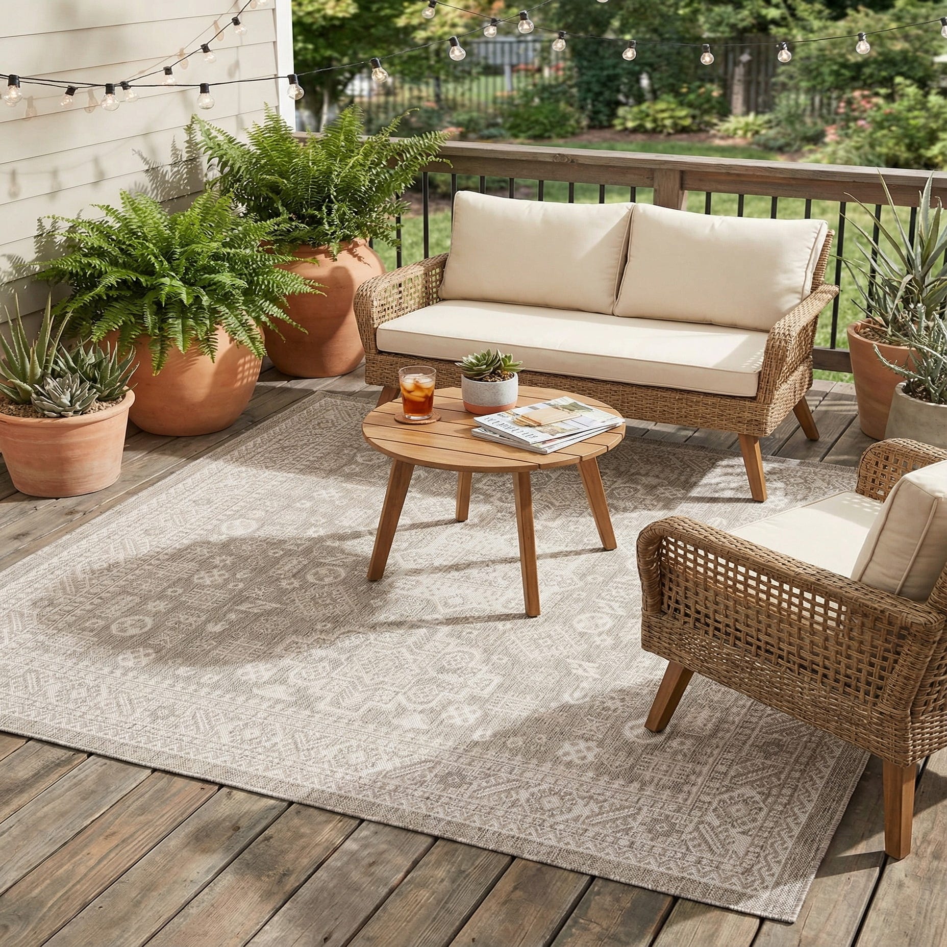 A 7' 10 x 7' 10 square gray indoor/outdoor rug with a detailed Southwestern tribal pattern and a flatweave texture.