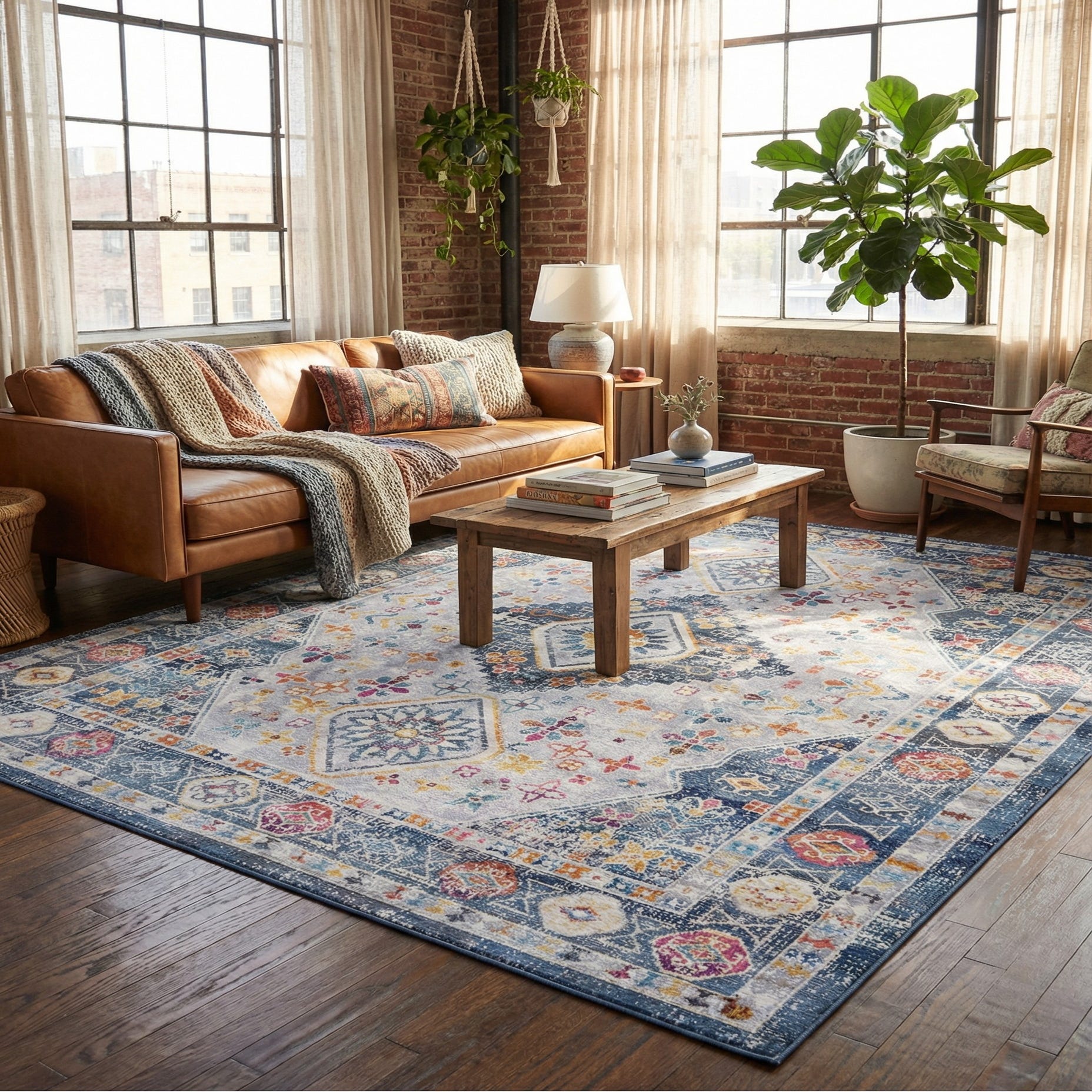 Machine-made construction of 70% polypropylene and 30% polyester produces a low-profile, soft hand with a slight sheen and a smooth surface underfoot. The texture lies close to the floor so furniture sits evenly, and the durable synthetic blend keeps pile consistent across the pattern. This rug works well in a coastal or modern farmhouse living room where the light-gray base and blue tones anchor neutral furnishings, in a transitional dining area beneath a wooden table, or in a layered bedroom scheme with mixed textiles and warm metallic accents. It also pairs nicely with mid-century or eclectic decor, where the colorful details can tie together varied finishes.