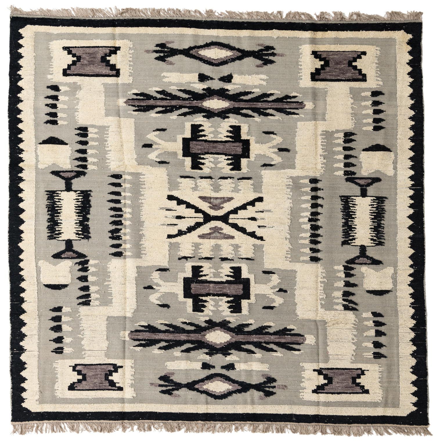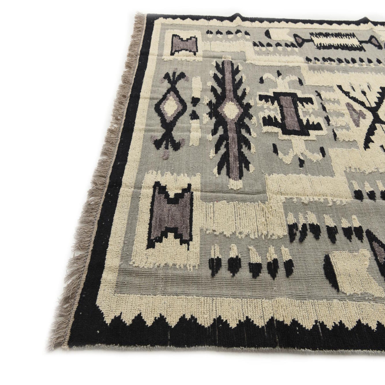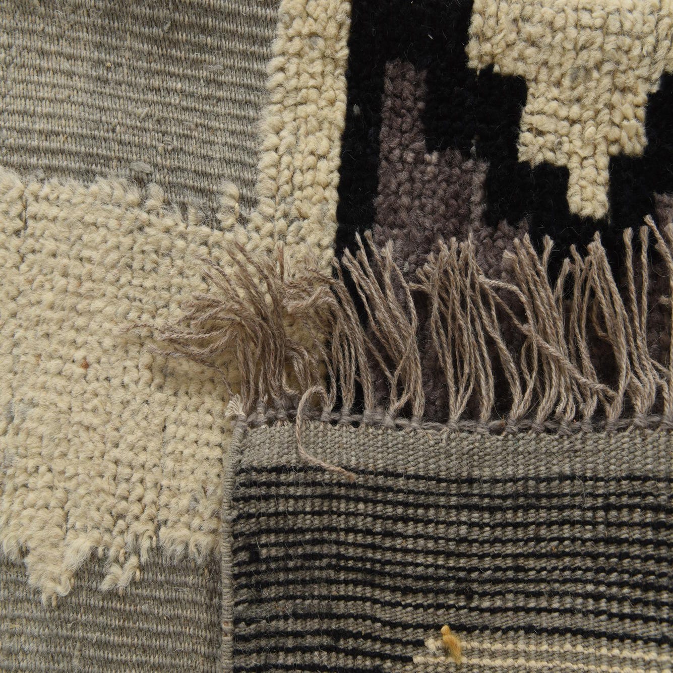 Due to its neutral colorway and timeless design, this rug integrates well with a variety of decor styles, from contemporary to traditional. It would serve as a striking anchor piece in a minimalist interior, providing interest without overwhelming the space, or complement a bolder eclectic aesthetic with its intricate patterns. Its robust hand-knotted wool construction is suitable for high-traffic areas like living rooms or dining spaces.