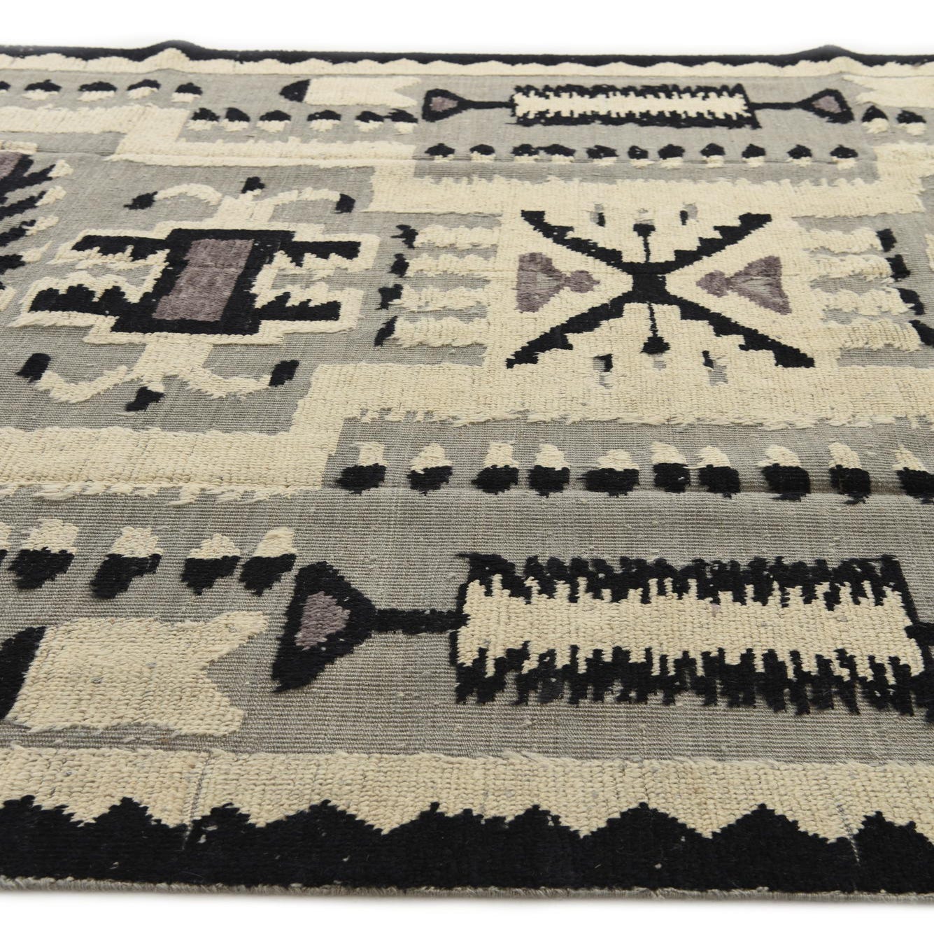 Its pattern is an engaging mix of geometric and tribal motifs, arranged in a harmonious symmetrical layout. Bold, black borders frame the design, while the light gray backdrop allows the intricate patterns to stand out. Each end of the rug is finished with a delicate fringe that adds a traditional touch.