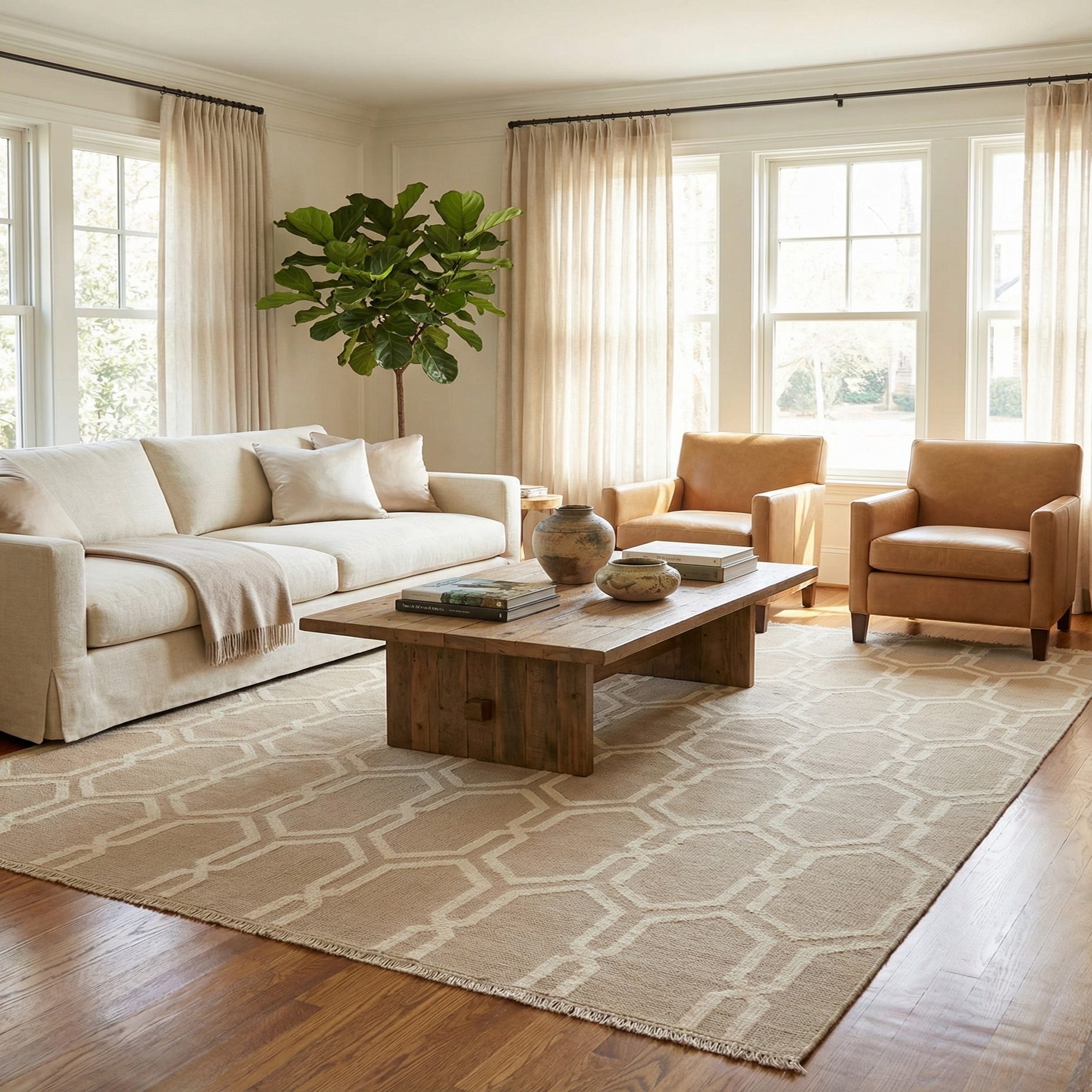 A rectangular 8x10 Luna Collection rug from Rugs.com featuring a modern geometric pattern in light gray and beige tones.