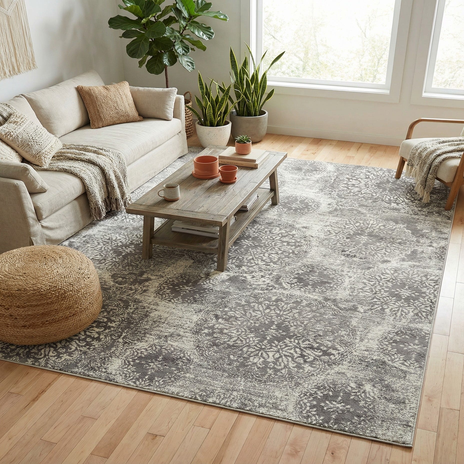 A soft, low-pile rug with a light gray ground and ivory medallion motifs arranged in a relaxed, scattered pattern. The design blends traditional floral medallions with a gently distressed field, giving the surface a worn-in, vintage-inspired look. Run your hand across the pile and you'll feel a smooth, dense texture with a subtle sheen common to polypropylene construction — comfortable underfoot while keeping a neat profile.