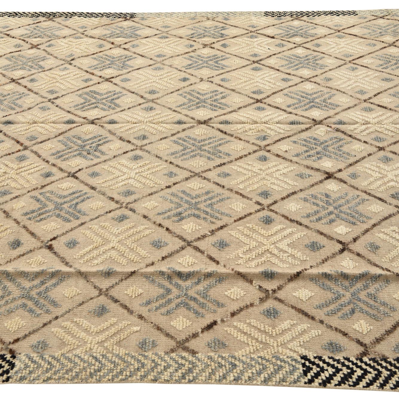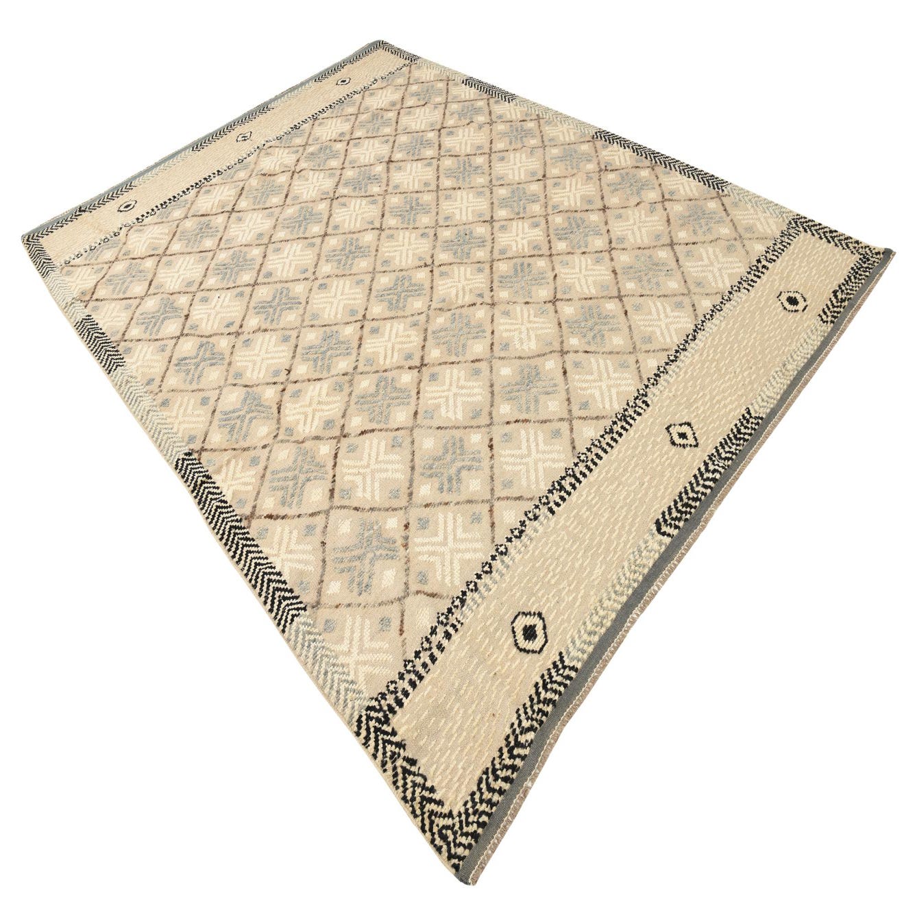 A soft light gray field sets a calm backdrop for a repeating diamond lattice punctuated by star-like medallions and tiny dotted accents. Brown lines trace the lattice, while ivory motifs and mid-gray highlights add contrast and subtle definition. Narrow end bands with small geometric motifs and black chevron edge details frame the composition, giving the rug a handcrafted, structured look. Hand-knotted in 100% wool, the surface has a substantial, cozy hand and tightly packed knots; the motifs sit just slightly raised against the ground, creating a tactile, low-profile texture underfoot.