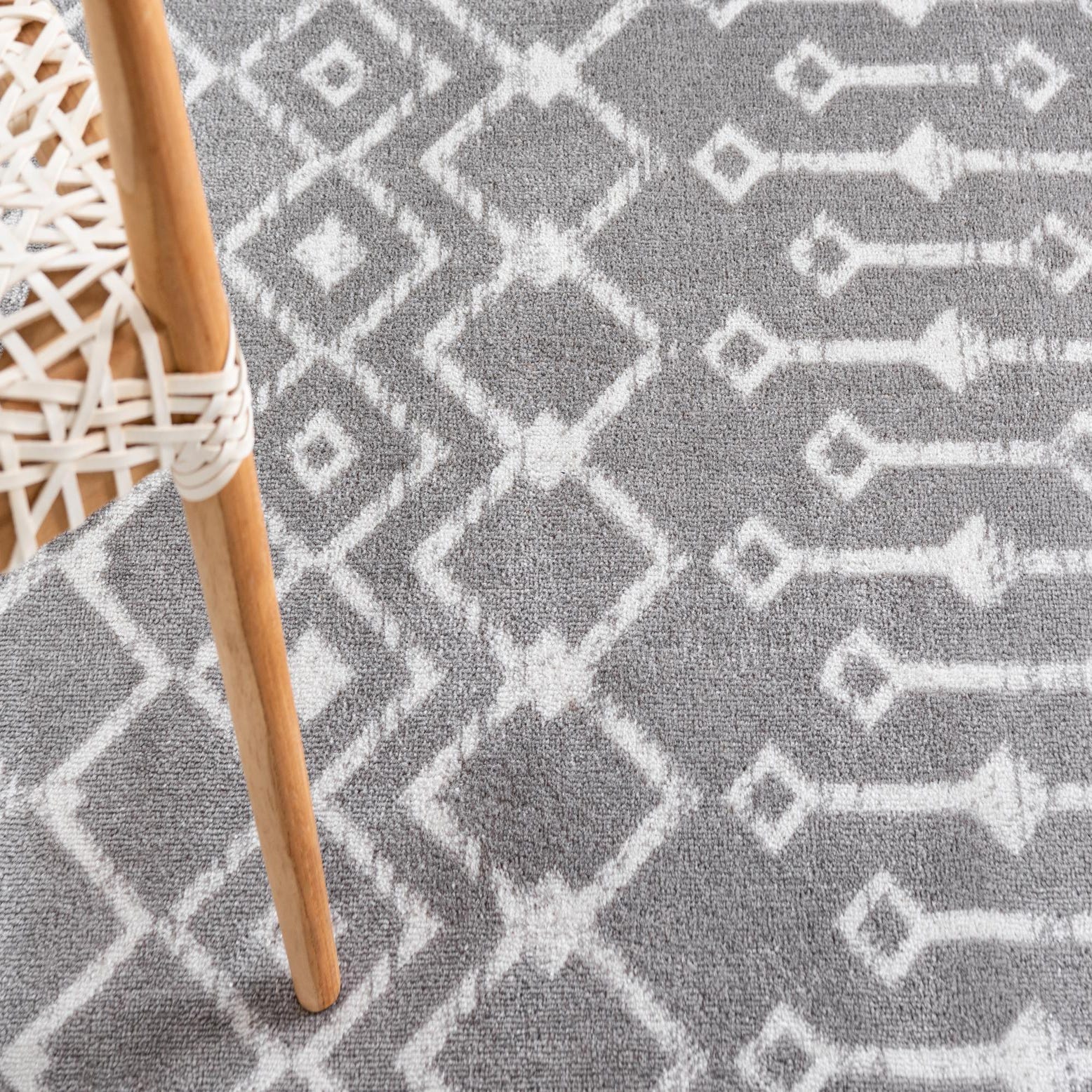 A rectangular 8x11 gray area rug with a modern tribal trellis pattern in light gray and white, suitable for a living room.