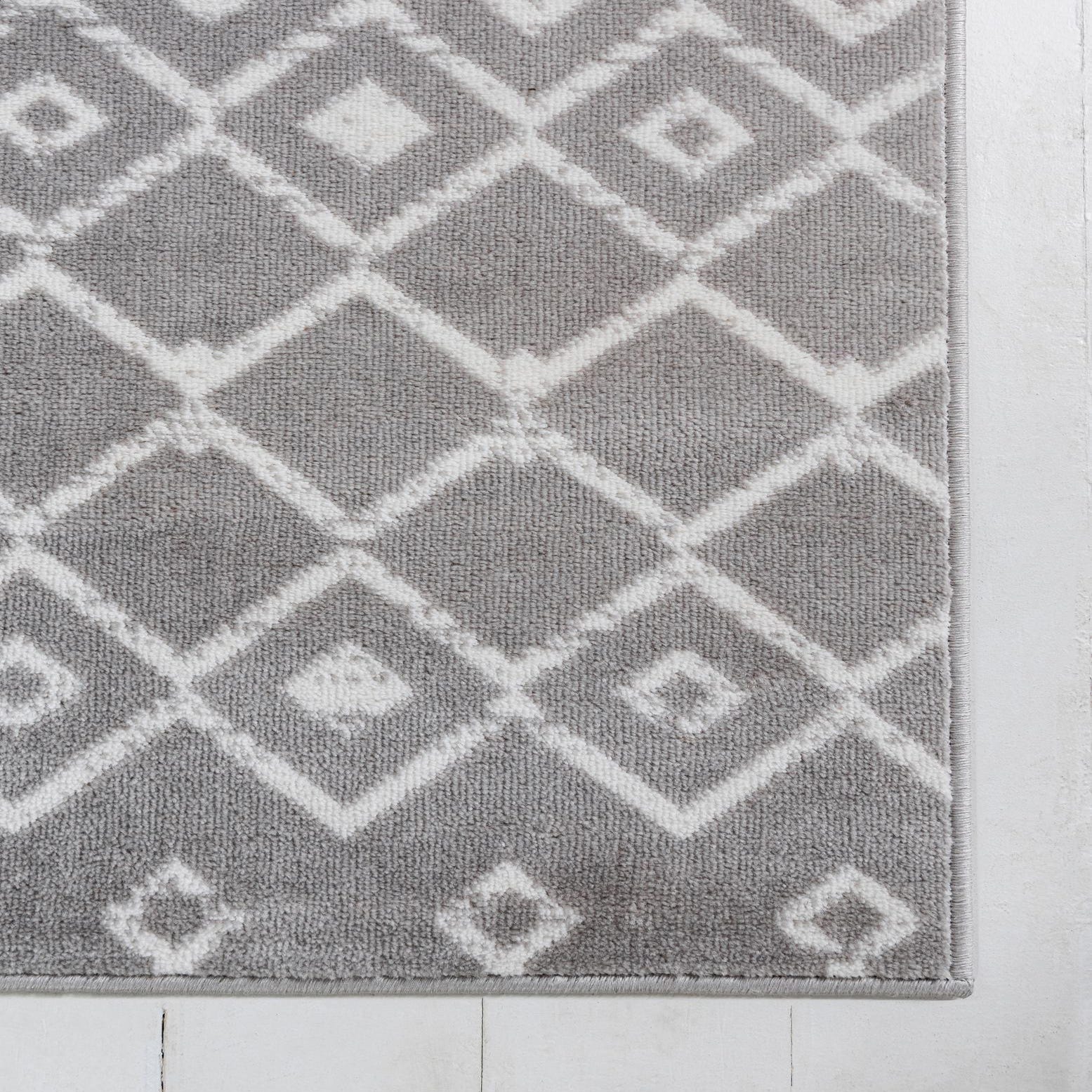 A light gray ground sets a calm backdrop for an ivory trellis pattern arranged in horizontal bands. Diamond lattices alternate with vertical, key-like motifs to create a modern take on traditional geometric design. Machine-made from 100% polypropylene, the rug has a low, dense pile that feels smooth underfoot while the slightly raised pattern adds subtle texture and a soft, natural sheen.