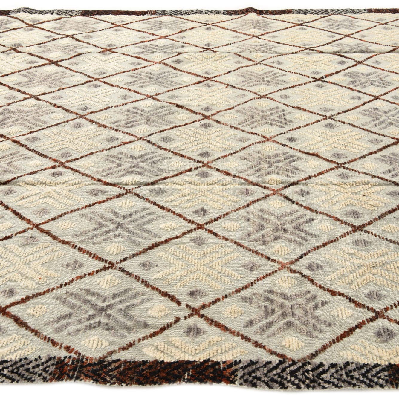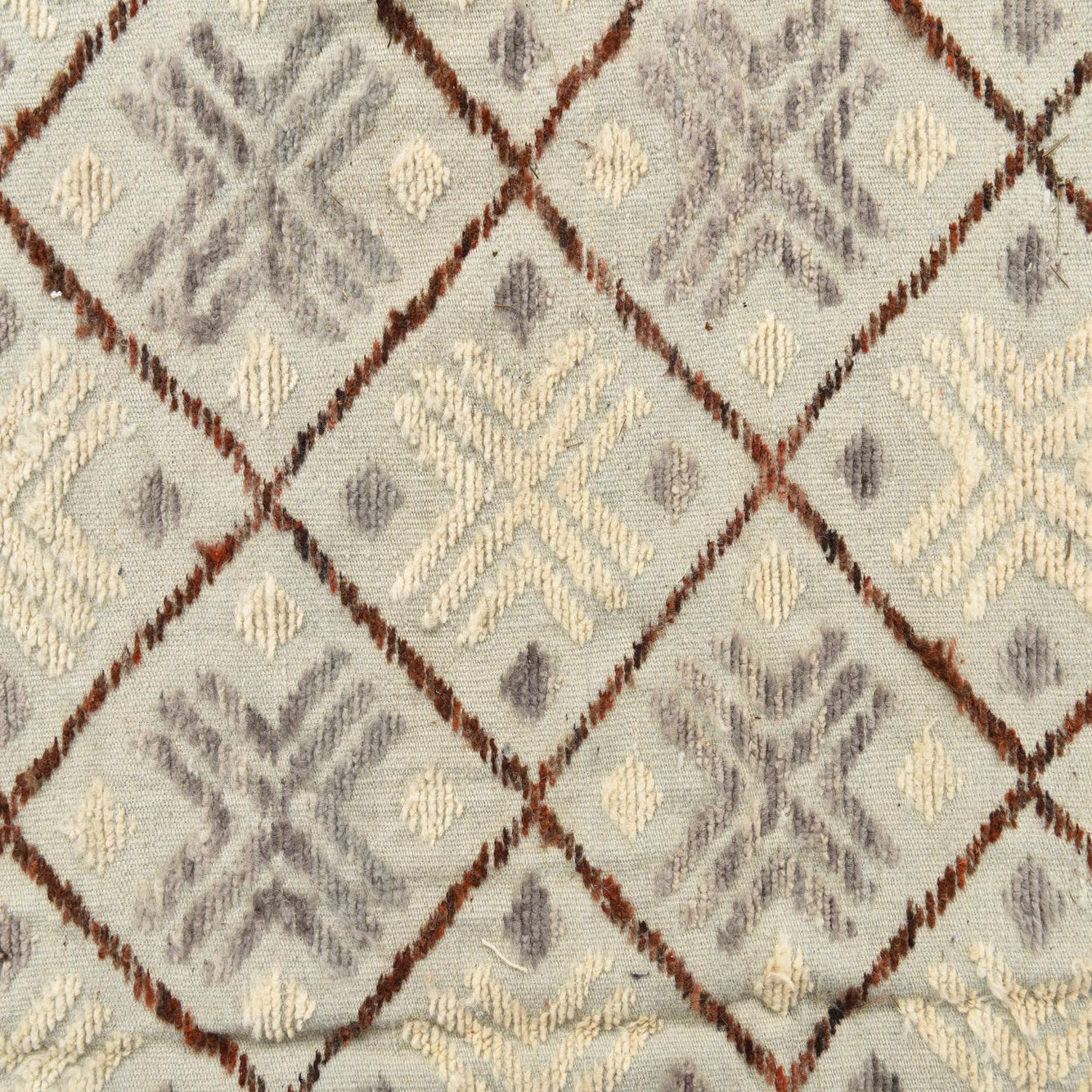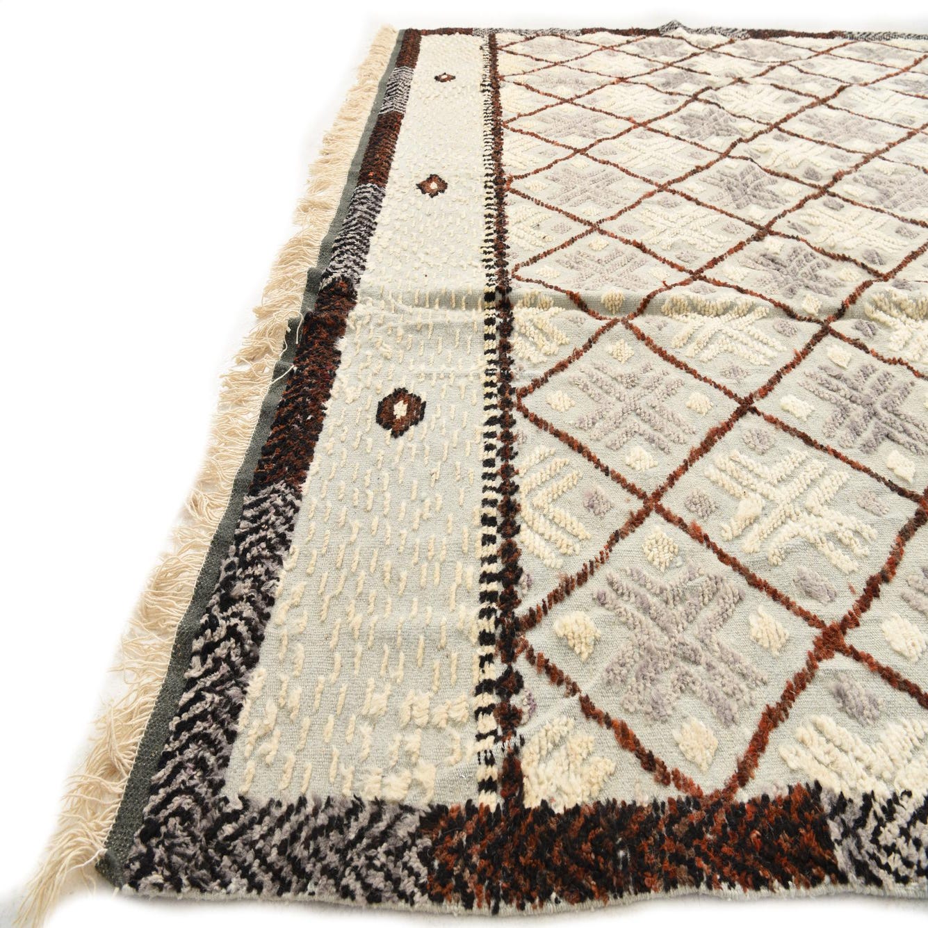 A soft light gray field sets a neutral stage for a classic diamond lattice pattern in rust red and brown, with alternating ivory and mid-gray star motifs nestled inside each diamond. A narrow herringbone-style border in black and brown frames the field, while ivory bands with small diamond medallions and short fringed ends add handcrafted character. Hand-knotted from 100% wool, the surface has a warm, slightly plush feel with subtly raised motifs that invite you to run your hand across the pile.