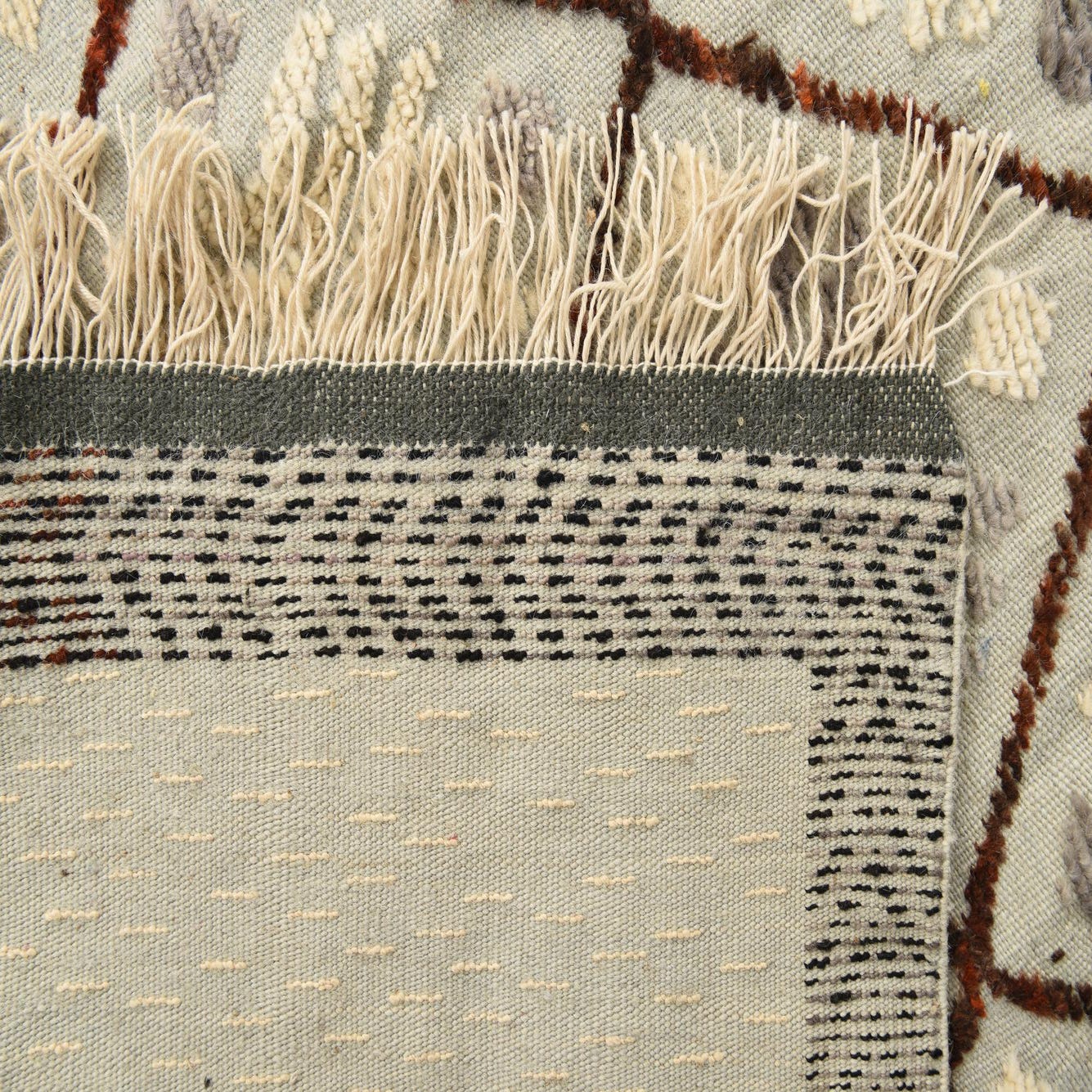 Primary color is Light Gray. Colors in this rug include: Light Gray, Black, Brown, Gray, Ivory, Rust Red.