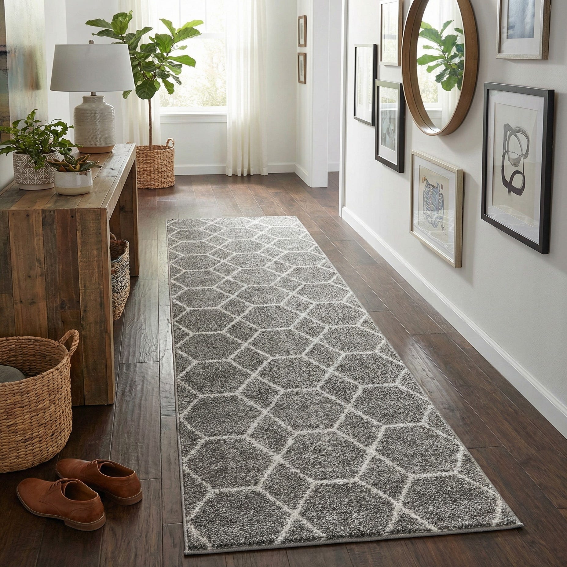 This runner works well in hallways, entryways, narrow kitchens or alongside a bed to define circulation and add warmth underfoot. It pairs nicely with modern and transitional interiors—think streamlined console tables, light- to medium-toned wood floors, or cool-toned painted walls—and also provides a neutral backdrop for stronger accent colors like navy, mustard or charcoal. Use it under a slim bench or layered beneath a simple runner-style runner setup to add visual interest without overwhelming the space.