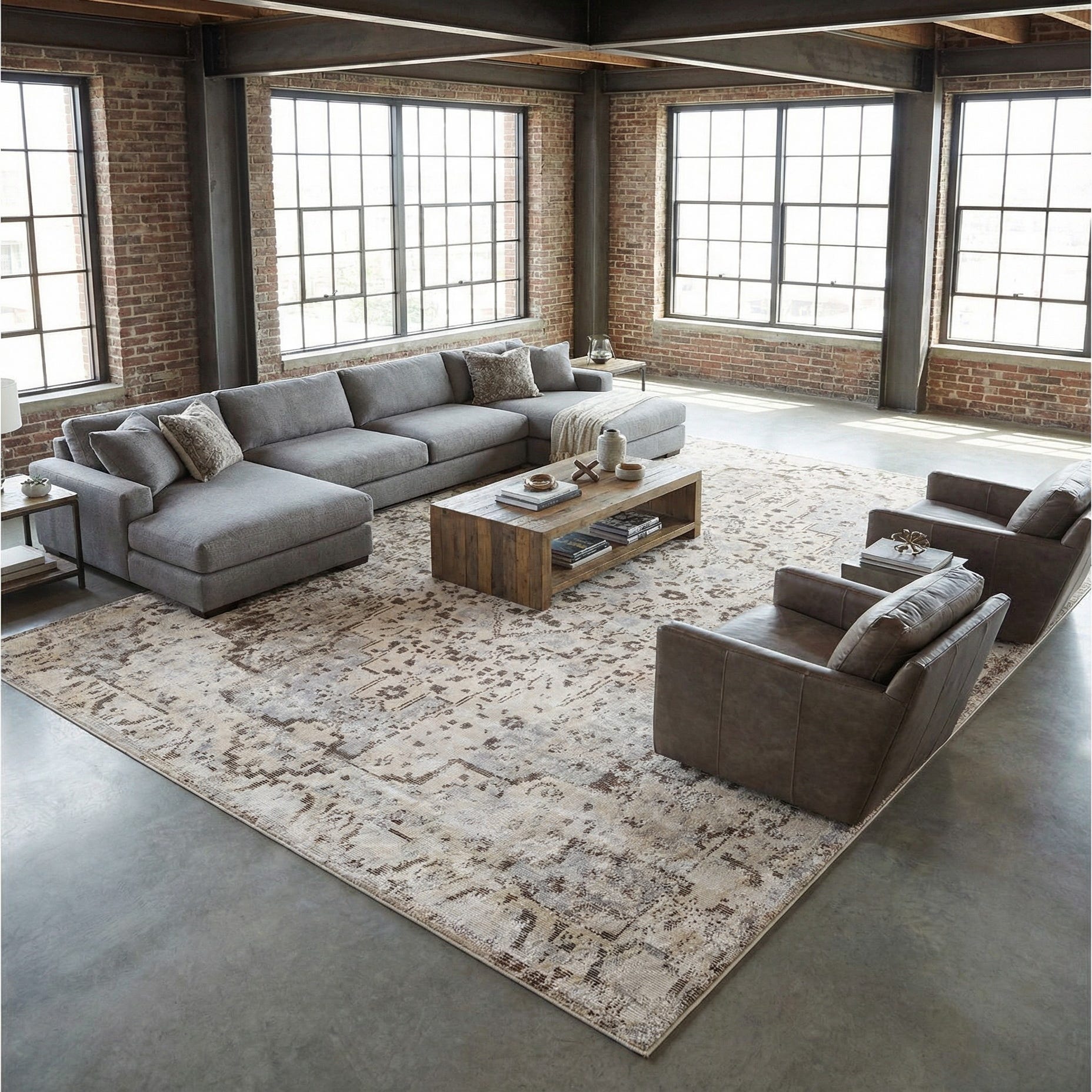 This neutral palette and gentle patina make the rug a versatile anchor for many interiors — place it beneath a sofa and coffee table in a living room, under a dining table to ground the space, or layered at the foot of a bed to add subtle warmth. It pairs well with warm wood furniture, leather seating, linen upholstery and mixed-metal accents, and suits transitional, modern farmhouse, Scandinavian and modern-traditional design schemes.