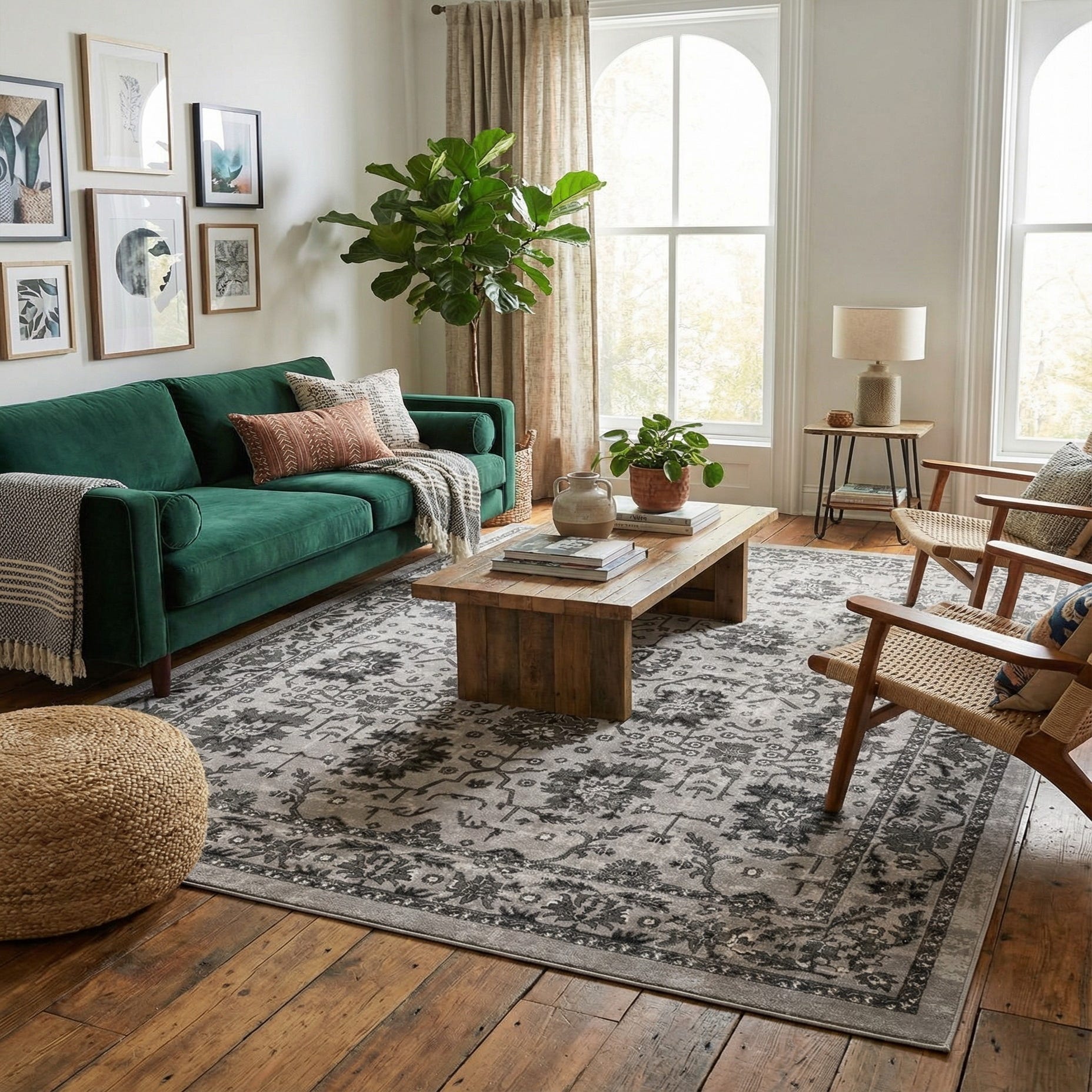 This rug works well beneath a living room seating arrangement or under a dining table to anchor a neutral palette, and it pairs easily with both modern and traditional furniture. Use it to soften a monochrome scheme with ivory linens and charcoal leathers, or layer it in a transitional space with warm wood tones and matte black metal accents for added depth and contrast.