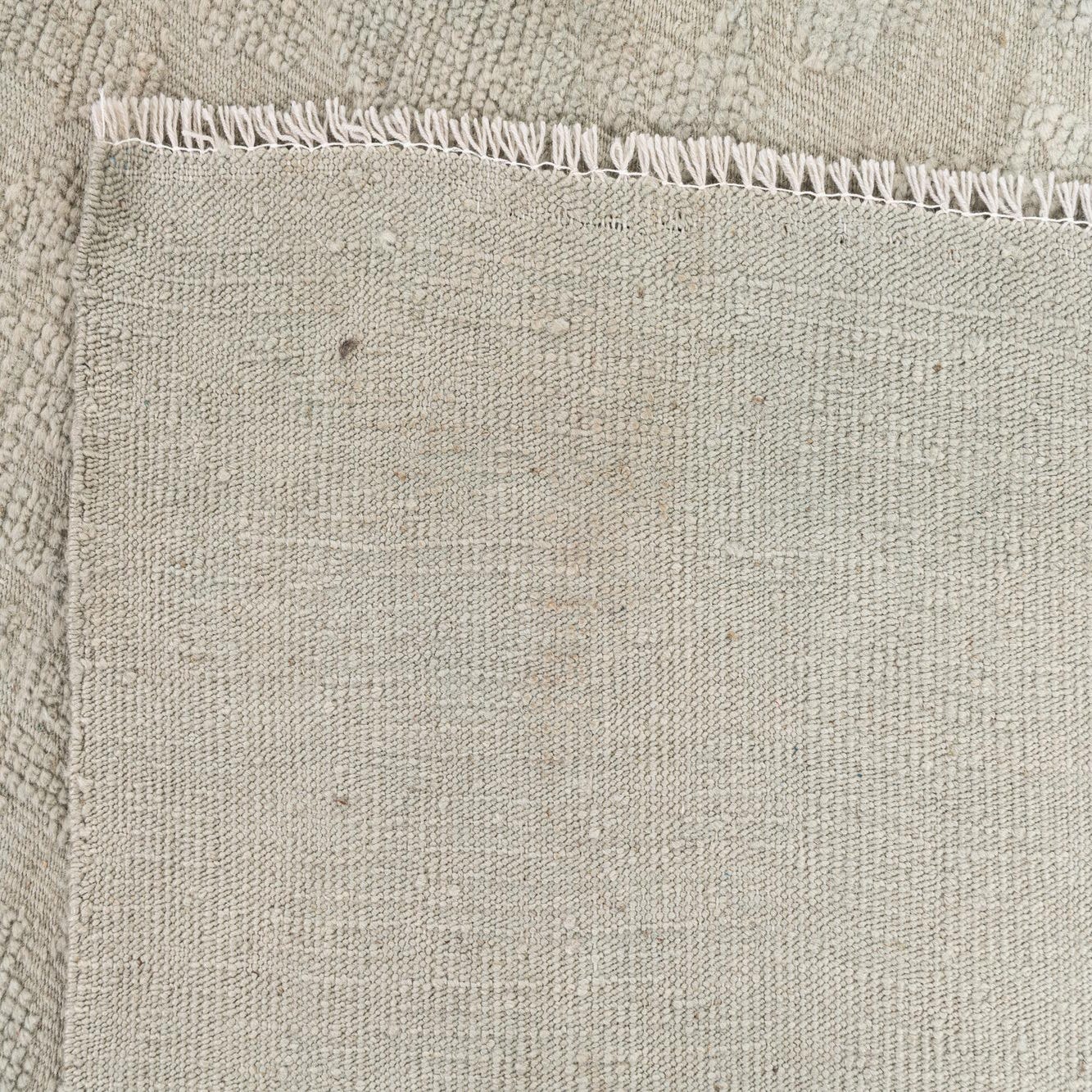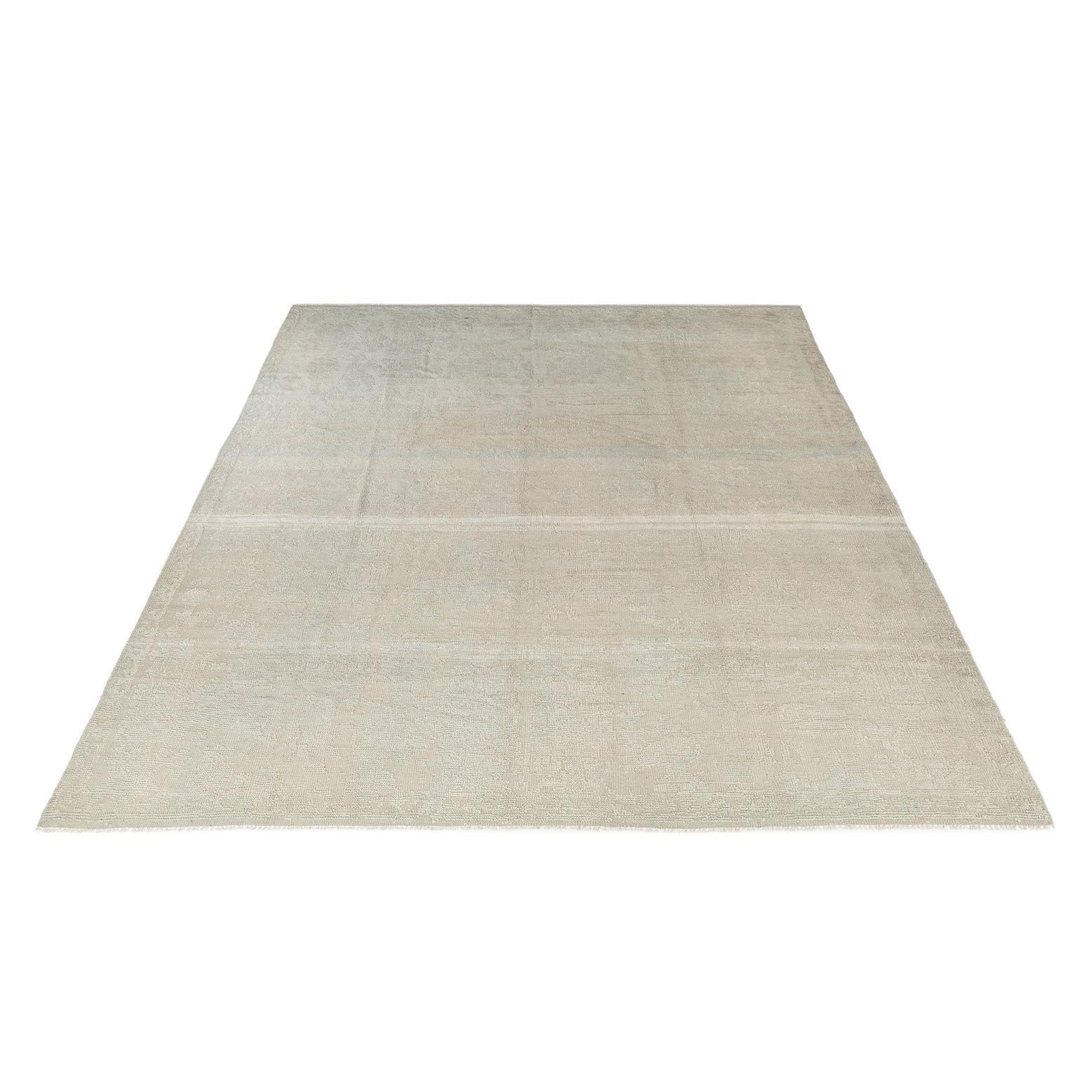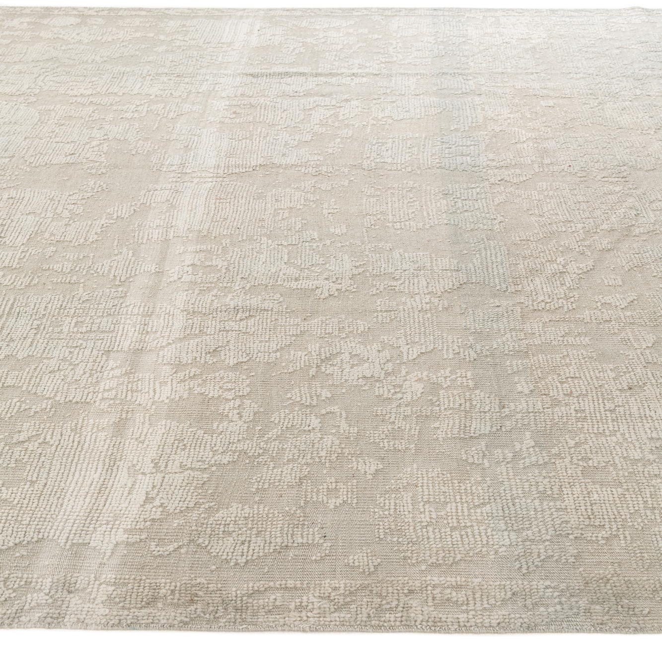 Hand-knotted from 100% wool, this rug has a soft light gray ground with a tone-on-tone, low-contrast motif that gives the surface a quiet, aged character. The pattern blends faint floral and geometric elements into an overall washed effect, while subtle pile variations and a low sheen add depth and a tactile, almost suede-like finish. Narrow, hand-finished edges and short fringe complete the look for a refined, understated presence underfoot.