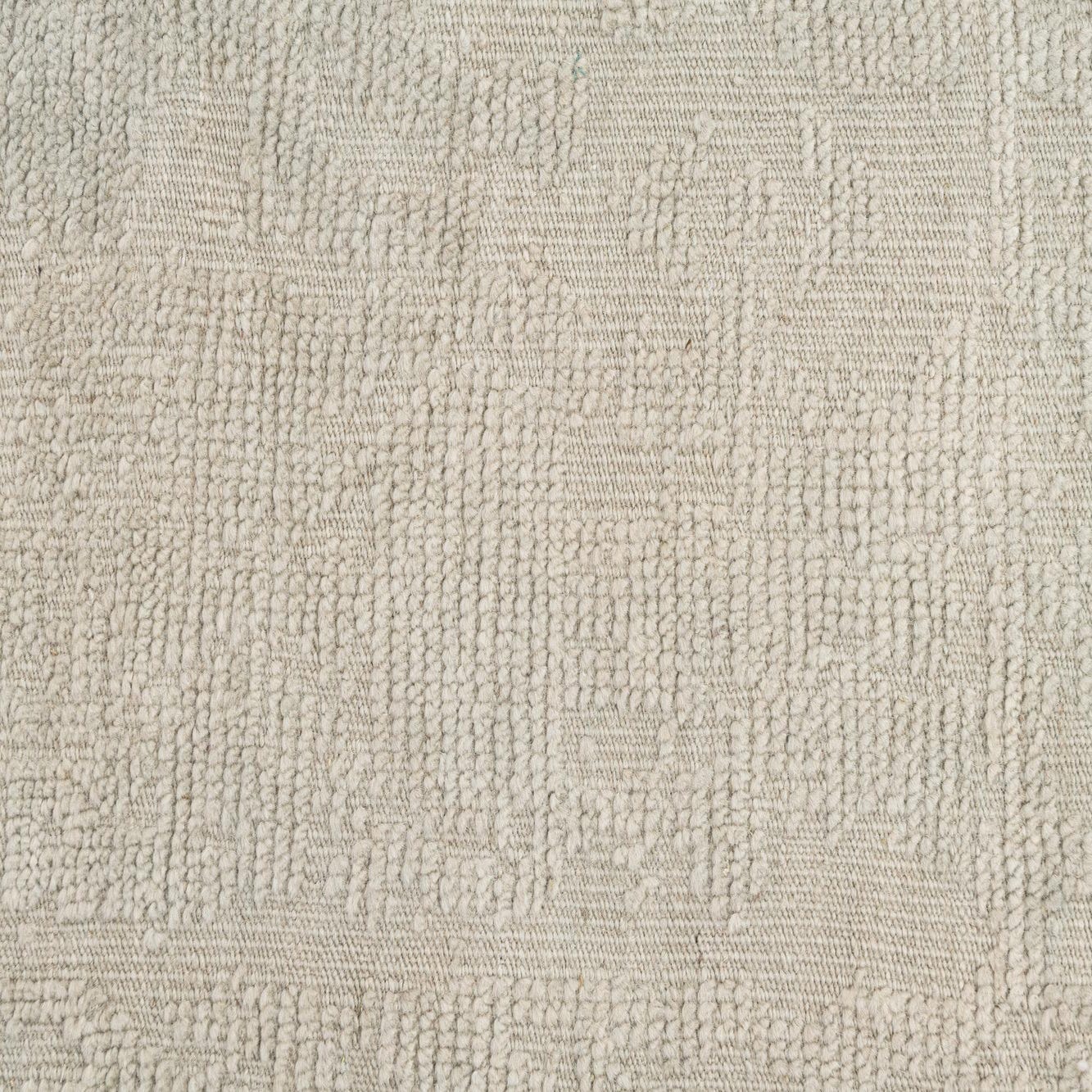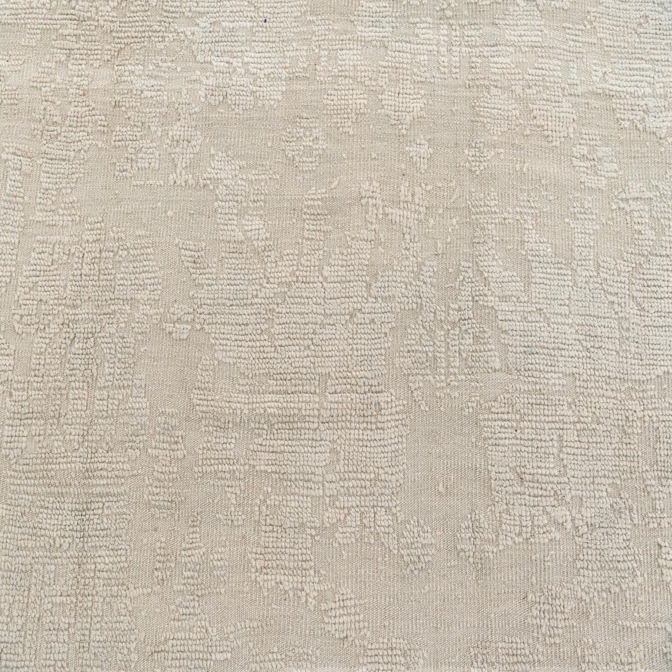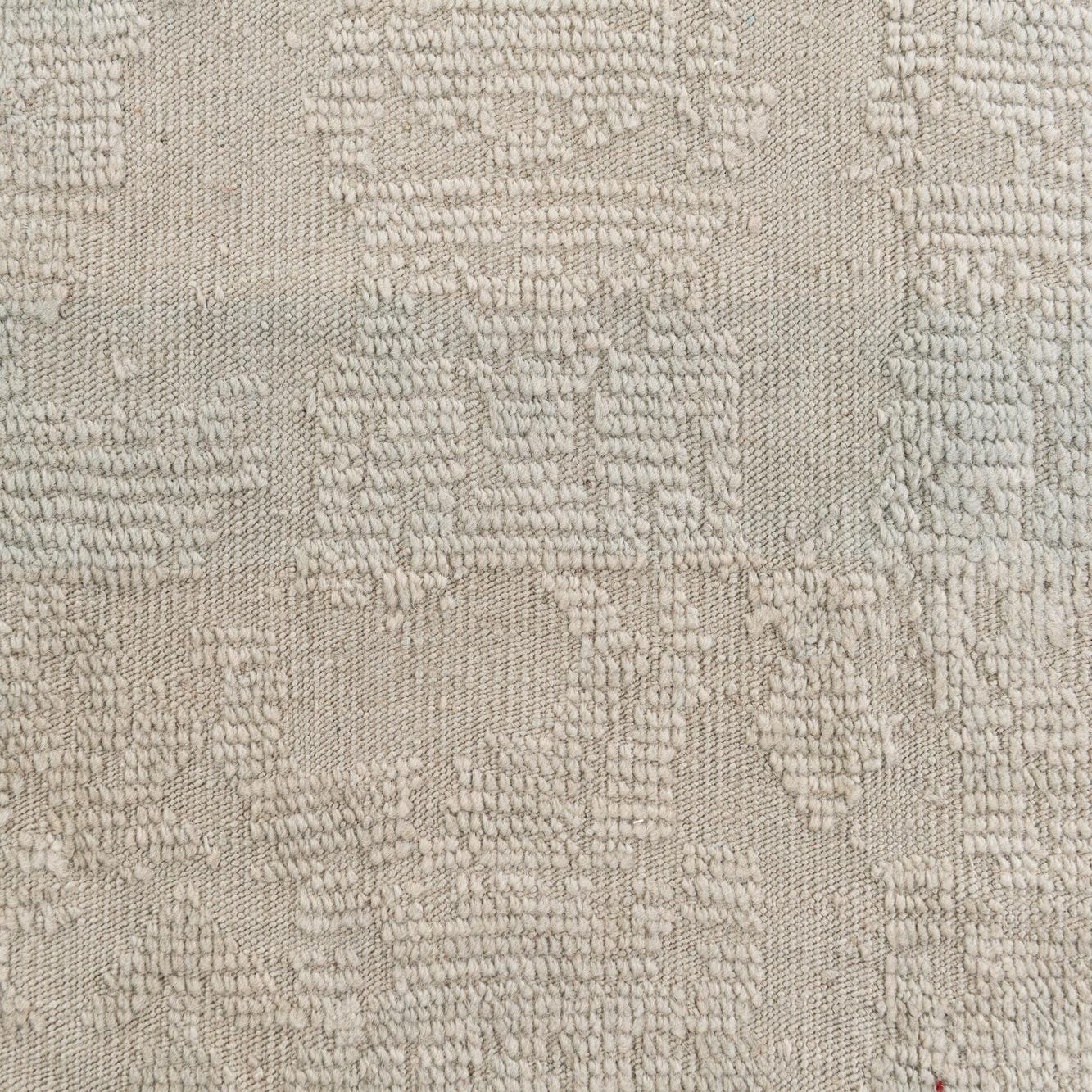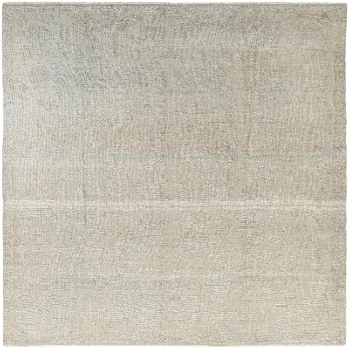 Hand-knotted from 100% wool, this rug has a soft light gray ground with a tone-on-tone, low-contrast motif that gives the surface a quiet, aged character. The pattern blends faint floral and geometric elements into an overall washed effect, while subtle pile variations and a low sheen add depth and a tactile, almost suede-like finish. Narrow, hand-finished edges and short fringe complete the look for a refined, understated presence underfoot.
