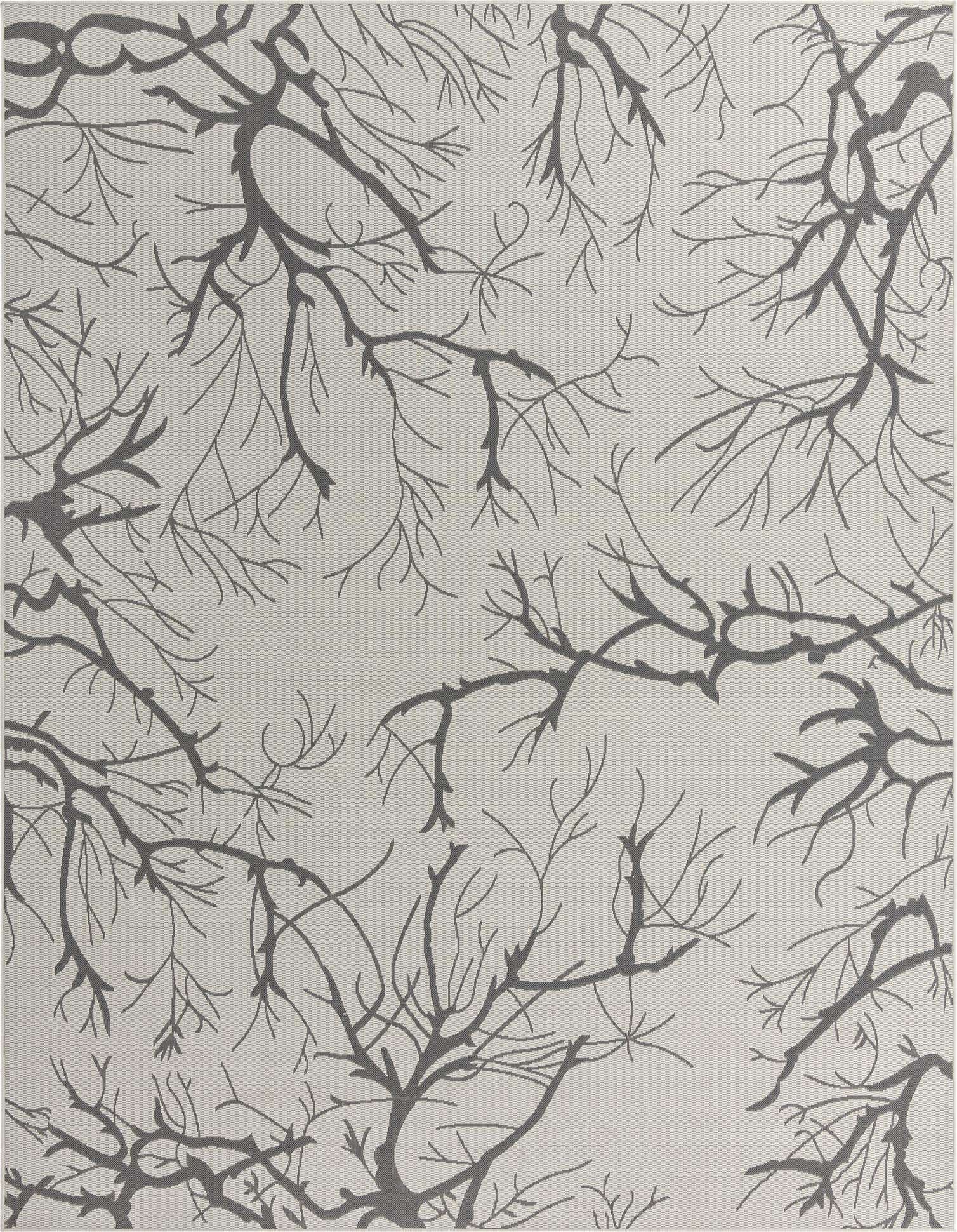 A delicate, all-over botanical branch motif sweeps across a light gray field in a balanced, contemporary pattern. Slim, organic branches in medium gray create an airy, graphic look that reads clean and calm against the pale background. The surface is a low-profile, tightly woven texture—machine-made of 100% polypropylene—offering a smooth, slightly ribbed feel underfoot that holds the pattern with crisp definition.